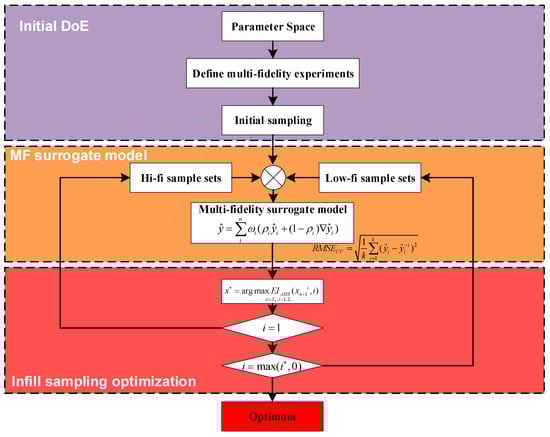 Figure 6 presents the optimization structure delineated in this paper, which is primarily categorized into three components: the initial design of experiments (DoE), the multi-fidelity surrogate model, and infill sample optimization. The Initial DoE involves sampling experiments at varying fidelity levels, utilizing Latin hypercube sampling (LHS). The multi-fidelity surrogate model incorporates the MHK model and employs Predictive Estimation of Model Fidelity (PEMF) for root-mean-square error (RMSE) cross-validation, thereby enhancing the accuracy of the model. Additionally, the Adaptive Sequential Infill Sampling (ASIS) strategy proposed in this paper is utilized for effective discrimination among multi-fidelity points.