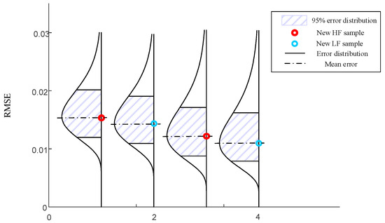To further demonstrate the efficacy of the proposed method, the trial iteration limit is established at 10, with a corresponding RMSE convergence value of 0.01. For the purpose of comparison, we employ several methods, including VF-EI, augmented EI, and AMEI, utilizing the surrogate model that was originally proposed with these methods. Additionally, to control for variables, we incorporate the MHK surrogate model utilized in this paper for a comprehensive comparative analysis. The results of contemporary surrogate models employing various infill sampling strategies are delineated in Table 1. The median error predictive distribution of RMSE via PEMF is shown in Figure 12. While the optimal value is denoted as , it is observed that both the original EI and the augmented EI methodologies predominantly focus on the incorporation of high-fidelity samples during the sampling process. Conversely, the VF-EI and the AMEI minimize the inclusion of a limited number of high-fidelity samples; however, these approaches still necessitate multiple cycles of sample addition, leading to a significantly high total computational cost. The strategy introduced in this paper, referred to as MHK+ASIS, successfully reduces both the quantity of high-fidelity samples added and the overall number of samples incorporated, while maintaining comparable accuracy.