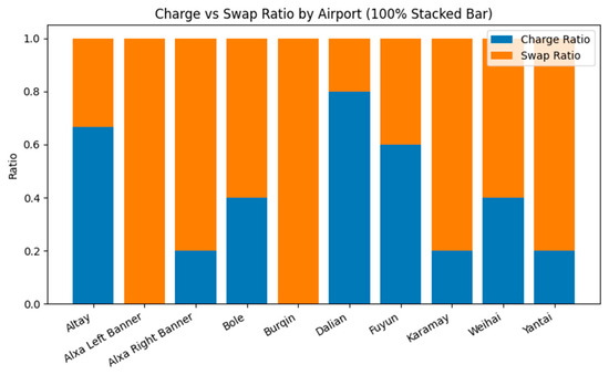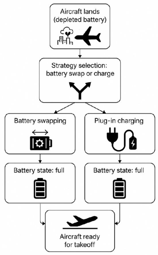 Compared with conventional aircraft, e-aircraft may not only require longer or more flexible stopover charging times during ground operations, but also their peak charging power, backup battery management, and modifications to the ground power supply network will put unprecedented pressure on airports [21]. In addition, how to ensure that aircraft power can meet the demand of subsequent flights within a tight flight transit window also puts higher demand on the airport’s charging and swapping processes and scheduling strategies. Under high-intensity flight execution, a single plug-in charging or battery replacement mode is often difficult to meet all the demand: in the case of a long layover, direct plug-in charging can make full use of the idle window and reduce the size of spare batteries and maintenance investment; however, in the case of a tight turnaround or peak hour, high-power plug-in may lead to a surge in peak power costs or delays due to the inability to recharge in a timely manner. In this case, the battery replacement program can provide rapid full-charge support, but it requires a sufficient number of batteries in good condition, and the investment and management costs are relatively high. If flight connections and cross-field resource scheduling are further considered in a multi-airport network, the synergistic relationship between airports and turnaround connections will make the coupling between facility size, scheduling methods and operating costs more complex [22]. In summary, the rapid development and popularization of e-aircraft not only brings more multi-dimensional planning and operation challenges for airports, but also puts forward higher flexibility and integration requirements for the existing charging/power exchange model.