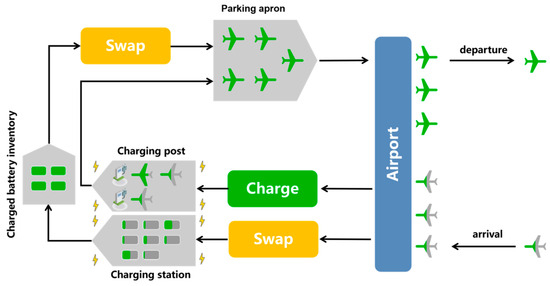 In order to portray the above challenges more systematically and build a feasible optimization model, it is necessary to first clarify the airport’s operation system under both plug-in charging and battery replacement modes. The overall architecture proposed in this study consists of key elements such as e-aircraft, battery module, ground plug-in charging facility, battery replacement station, and dispatch management system, and its operation logic is shown in Figure 1. The functions and interaction mechanisms of these elements will be introduced one by one in the subsequent subsections.