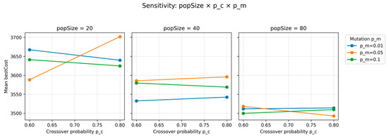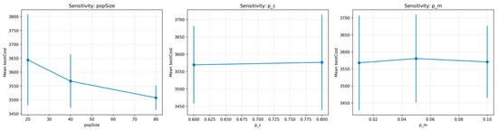 (charging power per aircraft per time period, n × m in total). Assuming that the airport handles n = 300 flights per day in a typical operational scenario, the optimization window is 24 h, the discrete time step is 5 min, and thus the number of time slots is m = 288, the LP problem size reaches about 8.6 × 104 variables with 1.7 × 105 constraints, and the runtime of the solver using a stand-alone CBC (Coin-or branch and cut) solver typically ranges from a few seconds to tens of seconds. the tactical layer charging/swapping strategy determination process is a flight-by-flight Boolean determination with O(n) computational complexity, which is negligible compared to the other layers. The complexity of the strategic layer genetic algorithm depends on the population size (pop) and the number of iterations (gen), and the overall complexity is O(pop × gen × LP(n,m)). In practical parameter settings, e.g., pop = 40 and gen = 50, the evaluation of about 2000 LP solutions can be accomplished in tens of minutes to meet the daily operation planning requirements of airports. Its performance is analyzed as shown in Table 6.