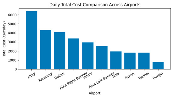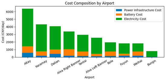 To validate the proposed three-layer optimization model, we present a case study based on Joy Air’s regional route network. Assuming that the existing conventionally powered models are fully replaced by Eviation Alice e-aircraft in future operations, the charging infrastructure configuration is optimized for the 10 airports involved. The optimization results show that the minimum total charging power required for the system is 2278 kW, and with 18 sets of backup batteries, the sustainable operation of the overall network can be guaranteed without affecting the normal operation of flights, which corresponds to an average daily operating cost of about CNY 22,583 (All monetary values are in 2024 CNY unless otherwise stated). The main contributions of this paper include the following: