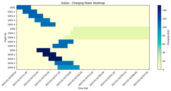 Regarding the linear programming solution performance, the LP problem of this model is highly sparse due to the fact that each flight only covers a finite number of time slots in which it actually stops, a property that is extremely suitable for fast solution by simplex or interior-point hybrid solvers (e.g., CBC, HiGHS, Gurobi, etc.). When the total_power_upper is not set sufficiently or the charging window is occupied by dense power exchange, it may cause the LP problem to be infeasible, but this situation can be quickly recognized by the solver’s state code. Since the variables are proportional to the constraint size, the memory requirement of the solving process is usually at the level of hundred MB for the size of n ≤ 500 and m ≤ 300, and the solving time is at the level of seconds to minutes, which satisfies the offline decision-making scenarios before the operation of real airports.