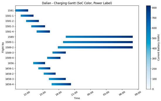 Dalian—Charging Gantt (SoC Color, Power Label). Individual turnarounds combine fast top-ups at busy hours (e.g., ~150 kW around 17:00) with slow overnight charging under low tariffs.