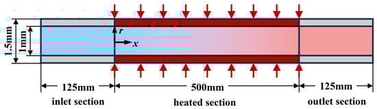 Figure 1 displays the geometric configuration of the physical flow model in a circular tube with an outer diameter of 1.5 mm and an inner diameter of 1.0 mm. The tube has a total length of 750 mm, containing a 500 mm heated section, a 125 mm inlet section and a 125 mm outlet section. The solid region is made of steel, with a thermal capacity of 500 J/(kg·K), thermal conductivity of 16 W/(m·K) and density of 8000 kg/m3.
