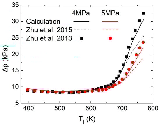 In previous work conducted by our research group, adopting the experimental conditions reported by Zhang et al. [], the calculated wall temperature was compared with the experimental measurements, and the accuracy of the aforementioned calculation method for predicting the convective heat transfer process of RP-3 was verified []. Additionally, in accordance with the experimental parameters described by Zhu et al. [], the calculation of flow resistance was also validated in our previous study. However, since RP-3 pyrolysis was not considered, the calculated flow resistance of RP-3 was much lower than the experimental value at temperatures above 720 K []. In the present research, the flow resistance was recalculated by taking the RP-3 pyrolysis into consideration. As shown in Figure 2, the pressure difference between the inlet and outlet of the adiabatic tube at temperatures above 720 K aligns more closely with the experimental results, with the maximum relative error reduced from 20% to 6%.