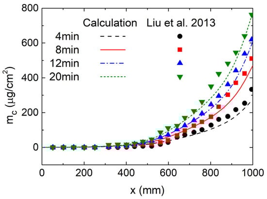 To validate the accuracy of coking calculations, the open published experimental data of Liu et al. [] were utilized. The pyrolysis process and coke deposition of RP-3 were investigated using the MC-II model based on the experimental conditions in reference []. Figure 3 shows the variations in coke deposition in a heated tube with a length of 1000 mm and a diameter of 2 mm. The results exhibit good agreement with the experimental results in most locations. To quantitatively evaluate the accuracy of predictions of the coking process, the total coke mass inside the tube was used to measure the relative error between the numerical and experimental results, as shown in Table 1. It can be observed from the table that the calculated coke mass agrees well with the experimental data, with the relative error at each time point not exceeding 13.8%, indicating that the calculation accuracy is acceptable for engineering requirements.