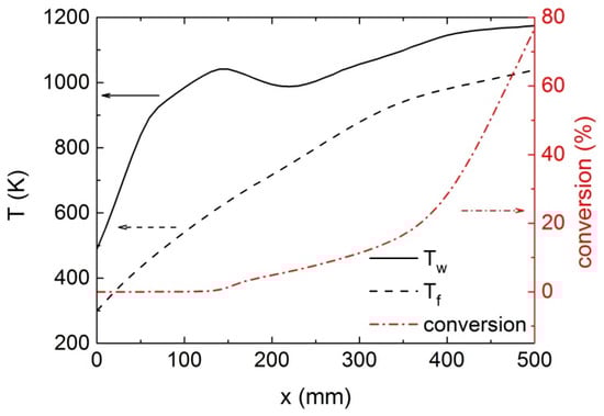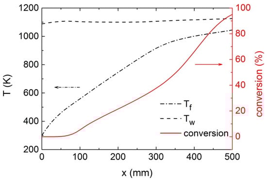 Figure 4 shows the distributions of the bulk fluid temperature, inner wall temperature and RP-3 conversion rate along the heated section at the initial time (t = 0 min), at a constant outer wall heat flux of 1.8 MW/m2. The RP-3 conversion rate and the bulk fluid temperature are defined by Equations (11) and (12), respectively. RP-3 pyrolysis is initiated at x = 120 mm, as shown in Figure 4; accordingly, the coking rate begins to increase, as depicted in Figure 5. In order to clearly show the variation in coking rate corresponding to different coking mechanisms, different longitudinal coordinate ranges are shown in Figure 5. Quantitative analysis reveals that, although both types of coking exhibit similar trends, the magnitude of the peak catalytic coking rate is approximately 30 times higher than that of lateral coking.