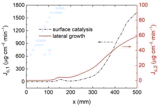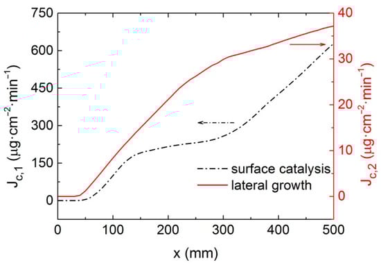 where Ac1 = 1.16 × 1015 μg·cm2·Ln1/(min·moln1), Ac2 = 2.21 × 105 μg·cm2·Ln2/(min·moln2), Ea1 = 232.3 kJ/mol, Ea2 = 80.5 kJ/mol, the reaction order n1 = 1.55, n2 = 0.14, and the decay constant γ = 0.14. Cp1, Cp2 and Tw,i are the molarities of the precursors and the inner wall temperature, respectively [].