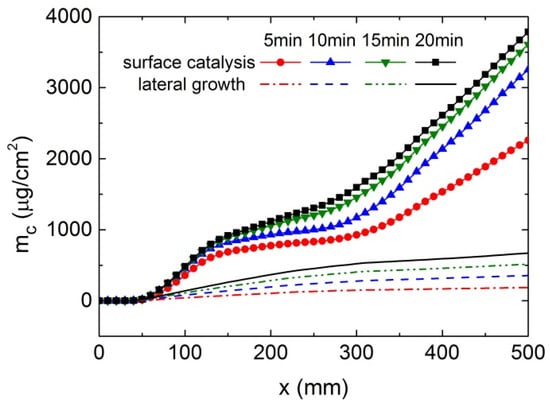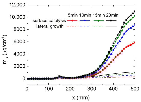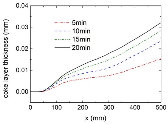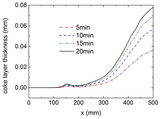 Figure 6 shows the coking distributions at different times. It is evident that catalytic coke depositions are much higher than lateral coke depositions. During the coking process, the catalytic coking increment decreases markedly over each 5 min interval, dropping from 5854 μg/cm2 near the outlet in the first interval to 718 μg/cm2 in the final interval. In contrast, the lateral coking increment remains relatively stable, at 293 μg/cm2 in the first interval and 274 μg/cm2 in the final interval. At t = 20 min, the amount of catalytic coking near the outlet is approximately 11,000 μg/cm2, the amount of lateral coking is around 1120 μg/cm2, and the coke thickness is nearly 0.08 mm, as shown in Figure 7.