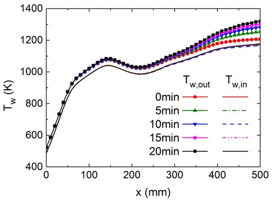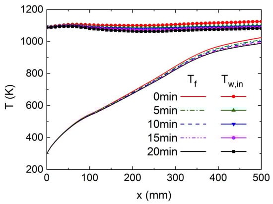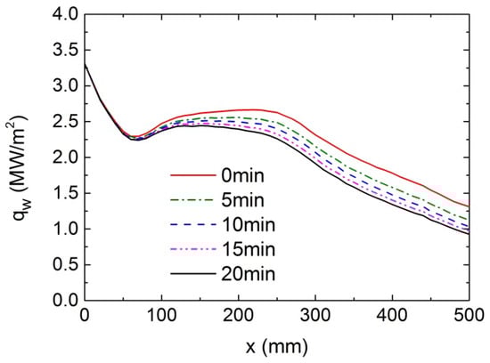 Figure 16 shows the distribution of heat flux on the outer wall of the heated section and its variation during the coking process. The heat flux decreases rapidly in the front part of the heated section, then goes up gradually and drops again in the second half. After t = 0 min, as is evident in Figure 16, the heat flux decreases by varying degrees in all parts of the heated section. This indicates that, at a constant outer wall temperature, the increased thermal resistance caused by coking reduces the heat input into the fluid and reduces the heat absorption capacity of the cooling channel. The reduction in heat entering the fluid region lowers the fluid temperature at the outlet; meanwhile, the temperature of the inner wall also slightly decreases, as can be seen from Figure 17.