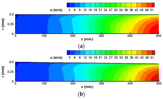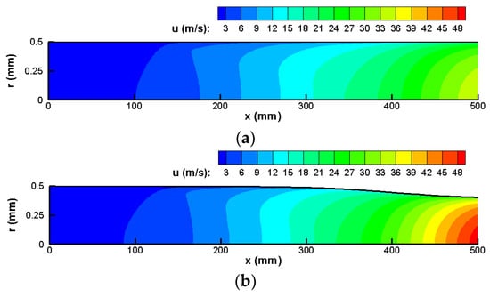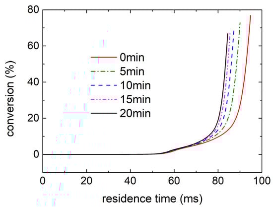Figure 18 illustrates the geometry of the fluid region and flow field at t = 0 min and t = 20 min in the semi-longitudinal plane. As shown in Figure 15, the coke thickness near the outlet of the heated section is about 3 mm at t = 20 min, resulting in a reduction in the diameter from 1 mm to 0.94 mm and a 12% reduction in the flow area. However, the change in fluid velocity in Figure 18 is not significant. This is because the occurrence of coking not only reduces the flow area but also lowers the fluid temperature, as depicted in Figure 17, leading to a higher fluid density. Consequently, the fluid velocity does not change markedly under the current conditions. Figure 19 shows the variation in the RP-3 conversion rate with residence time. It can be observed that due to the insignificant changes in the flow field, the difference in fluid residence time is negligible. Compared to t = 0 min, the fluid residence time at t = 20 min is reduced by only 1.5 ms. However, the conversion of RP-3 at the outlet decreased from 95% to 89%, mainly as a result of the lower fluid temperature slowing down the pyrolytic reaction rate.