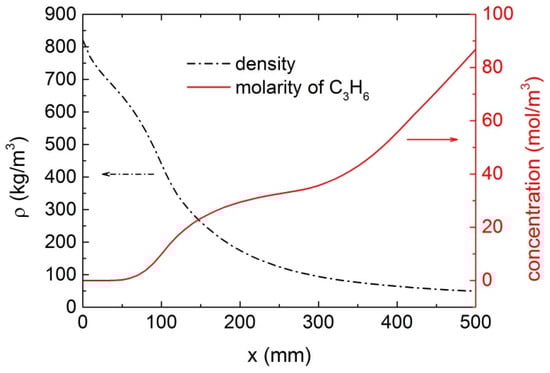 Distributions of fluid density and molar concentration of C3H6 at t = 0 min.