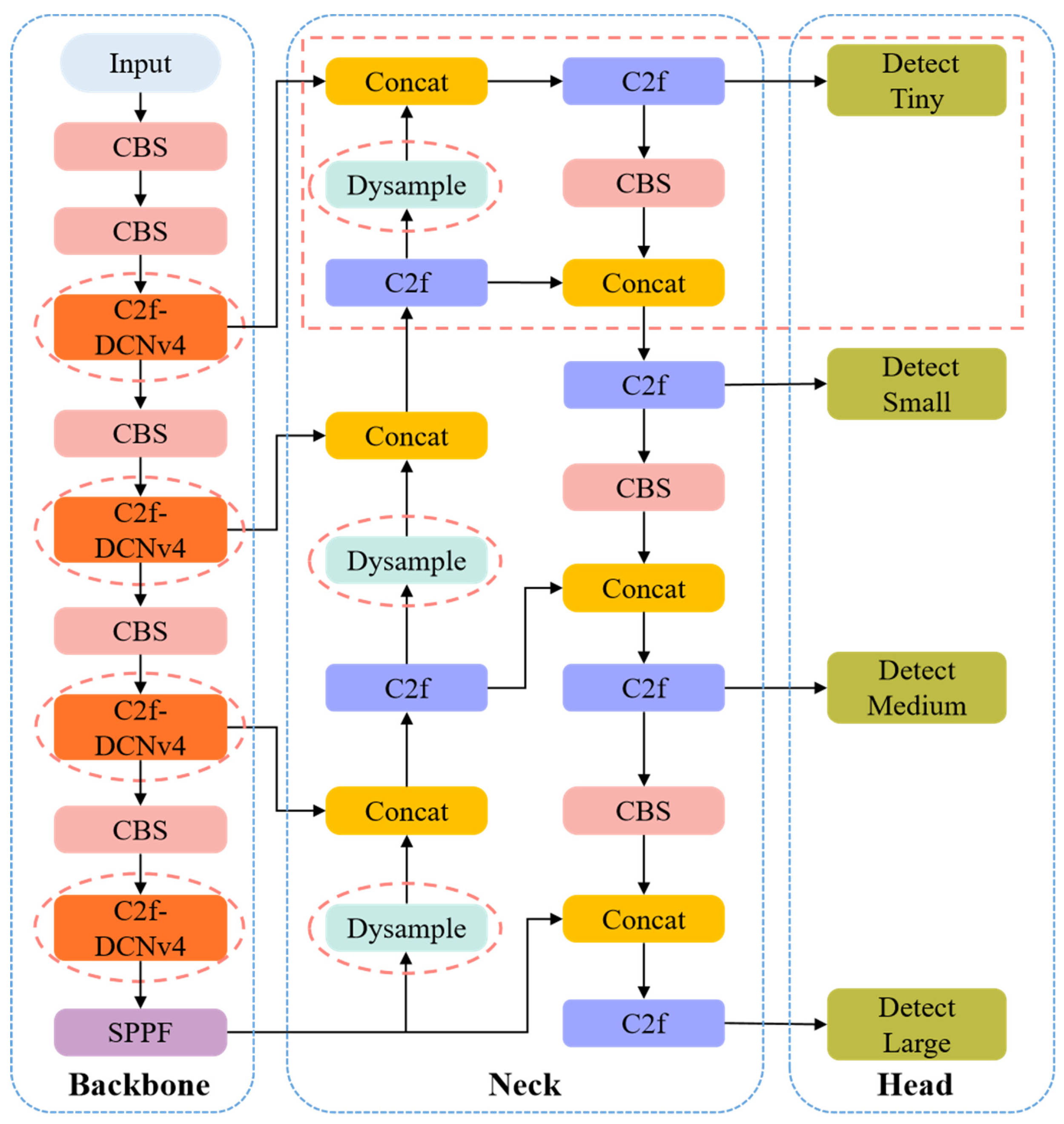 The input image is processed by the enhanced Backbone, where C2f-DCNv4 modules at specific stages extract features with adaptive receptive fields, particularly beneficial for irregular objects. The Backbone generates multi-scale features {P3, P4, P5} that are fed into the Neck.