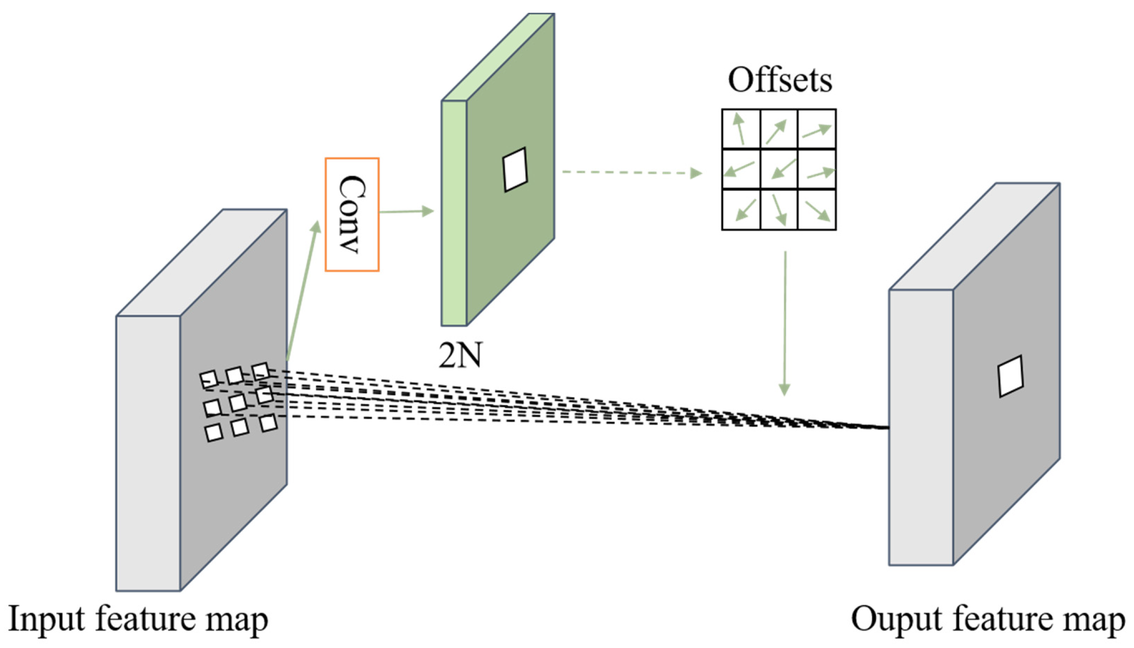 Figure 2), which uses a 3 × 3 convolution kernel that dynamically adjusts the extraction of input features based on offset prediction. It also interpolates the connection of nine samples in different channels to produce outputs consistent with the size of the input. This effectively improves the accuracy of detecting irregular contours and targets of different sizes.