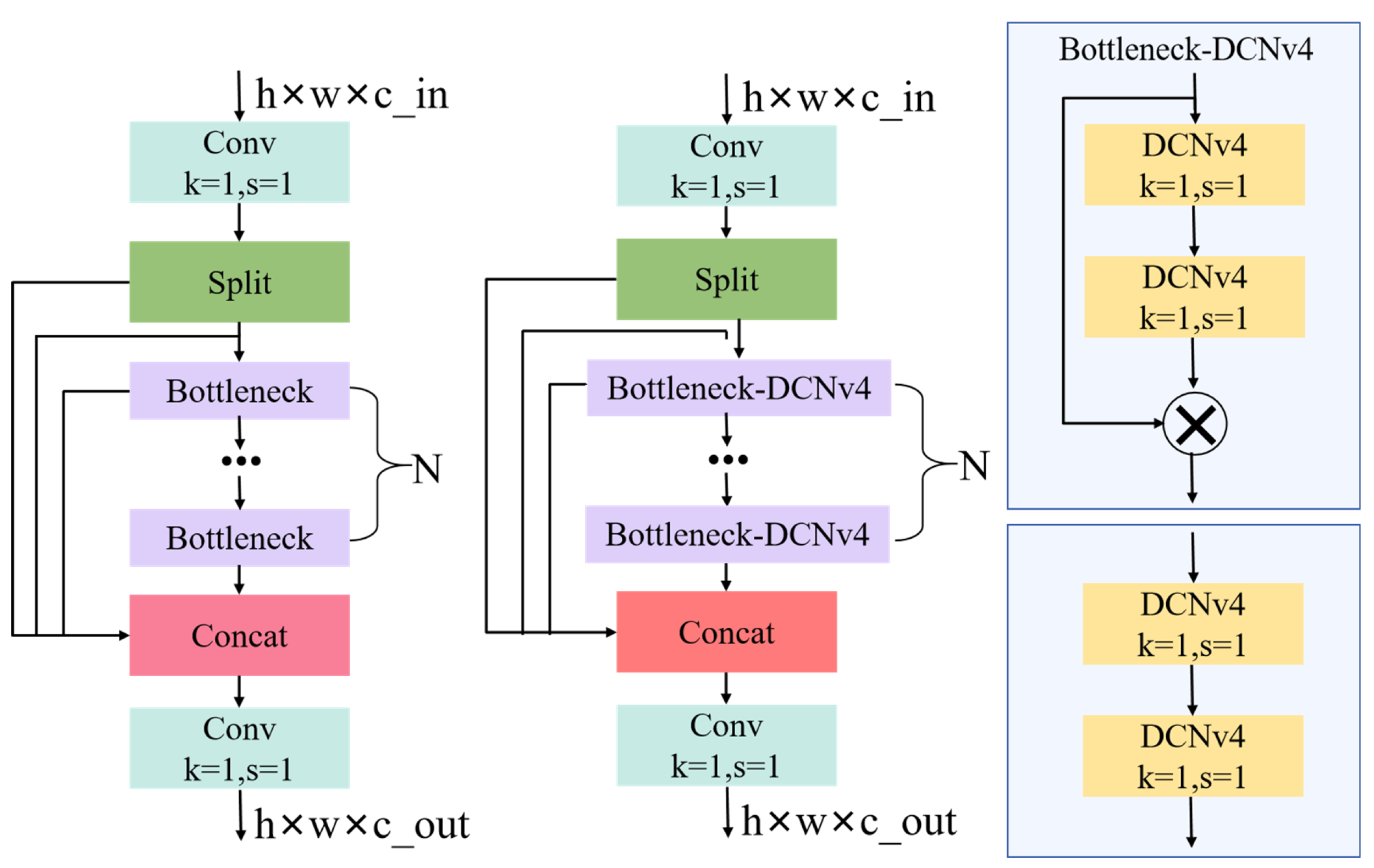 This paper presents a new feature extraction module, C2f-DCNv4, which is designed by incorporating DCNv4 into C2f, as illustrated in