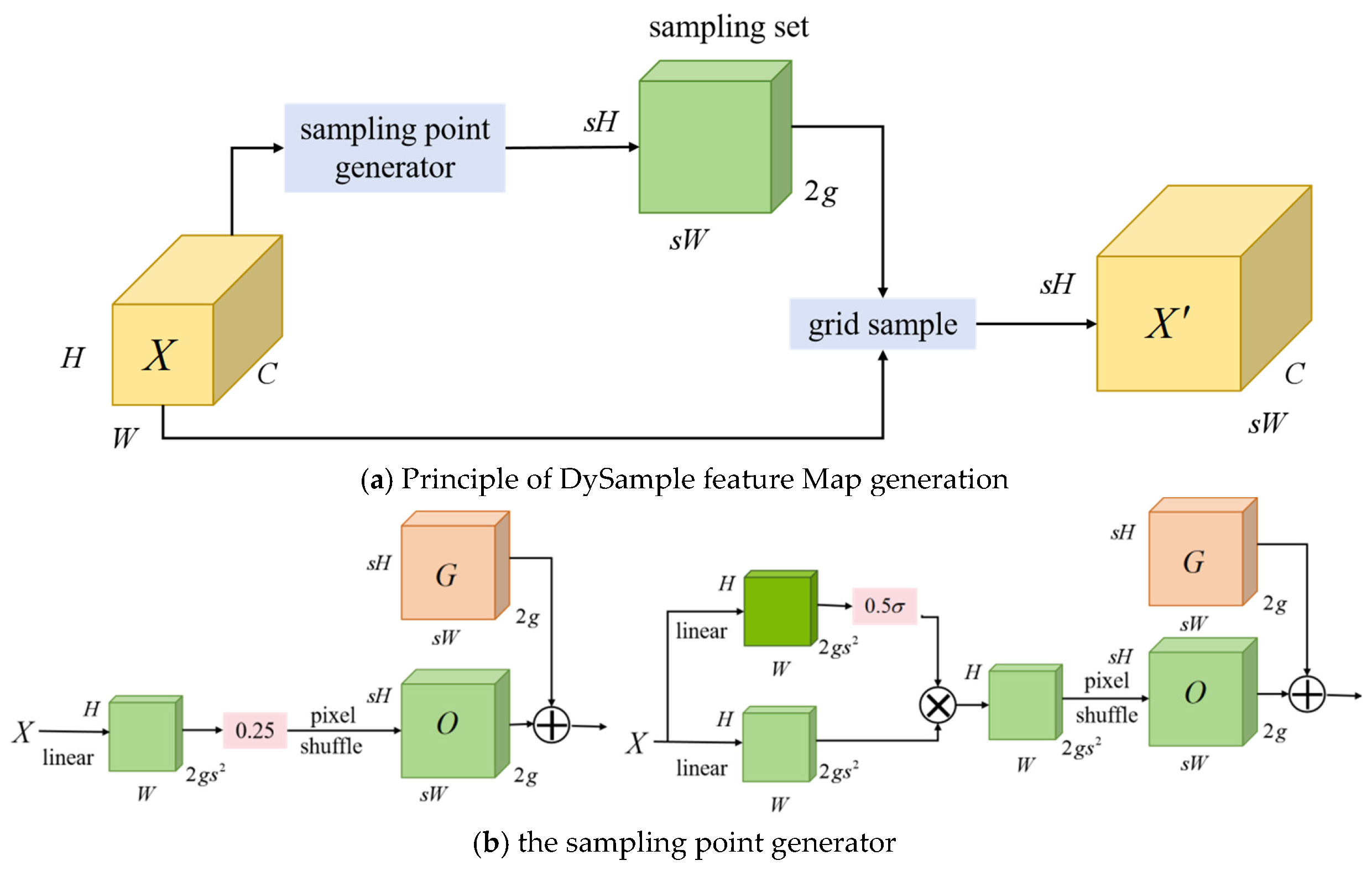 Figure 4. For an input feature map x of dimension H × W × C (height × width × number of channels), the system first constructs a collection of sH × sW × 2 sampling coordinates through a sampling point generator, and is given an upsampling scale factor s. Each point in the collection contains dynamic offsets in the x and y directions, which are used to guide the high-resolution reconstruction of the feature map. Subsequently, content-aware interpolation is computed on the original feature map using the grid_sample function of PyTorch. The final output is an up-sampled feature map X’ in sH × sW × C dimensions. This process achieves dynamic mapping from low resolution to high resolution while preserving semantic information.