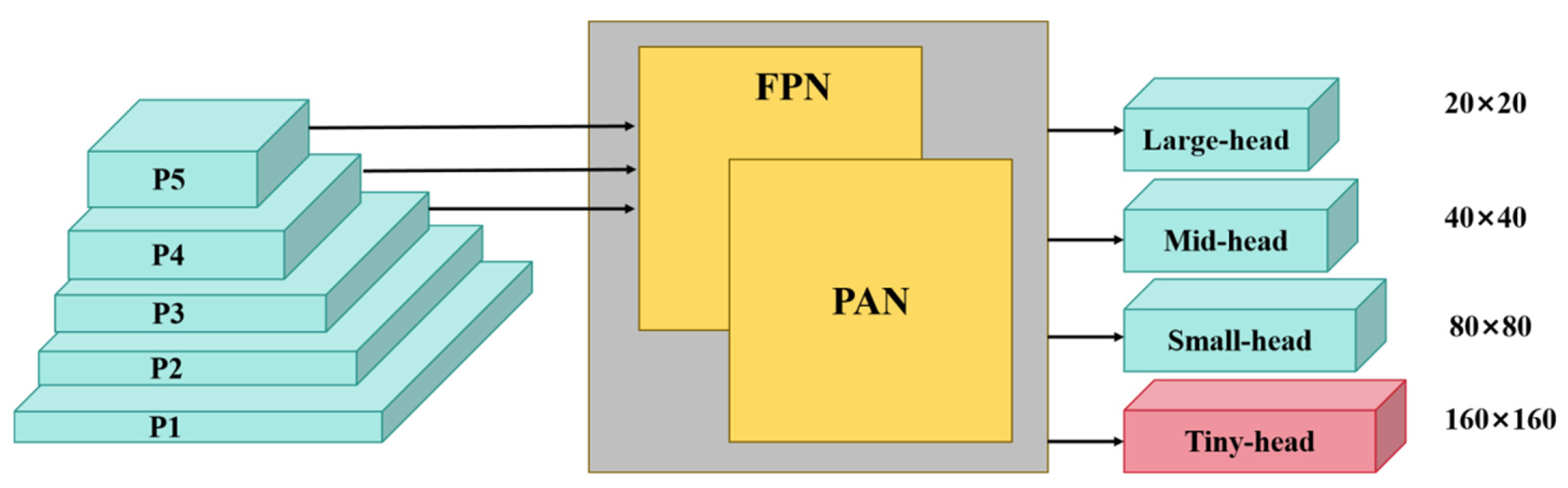 Figure 5. Subsequently, a multi-scale fusion of 160 × 160-sized feature maps with smaller-scaled feature maps is performed. This enhances the extraction network’s comprehension of the overall contextual information through the integration of shallow semantics and deeper semantics. Consequently, richer information about the underlying features is retained, thereby augmenting the detector’s capacity to generalize and learn about targets of different scales in aerial viewpoints. The overarching objective is to facilitate generalized learning capabilities for targets across diverse scales, with the ultimate aim of optimizing the perception of small targets in complex environments.