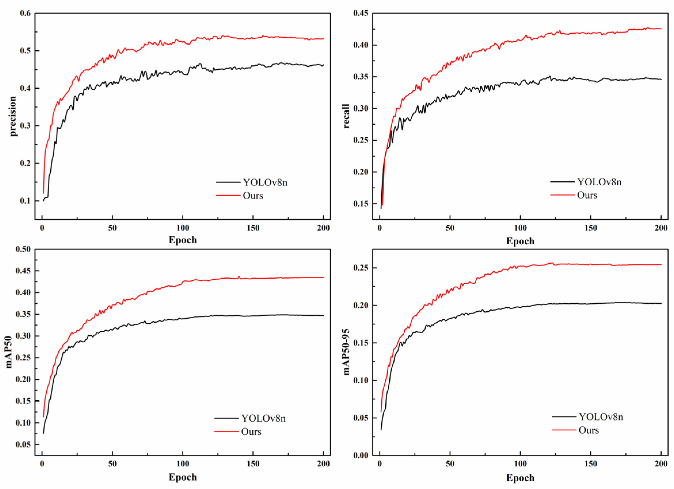 Figure 6 and it can be seen that the training curves of the improved model for all the indicators are significantly better than those of the baseline YOLOv8 model, which is specifically shown as follows: (1) all the indicator curves in the whole process of training (epoch 0–200) all the index curves are always located above the benchmark model; (2) with faster convergence speed and higher stability value. The overall upward trend of the training curves further confirms the performance advantage of the improved model in the target detection task.