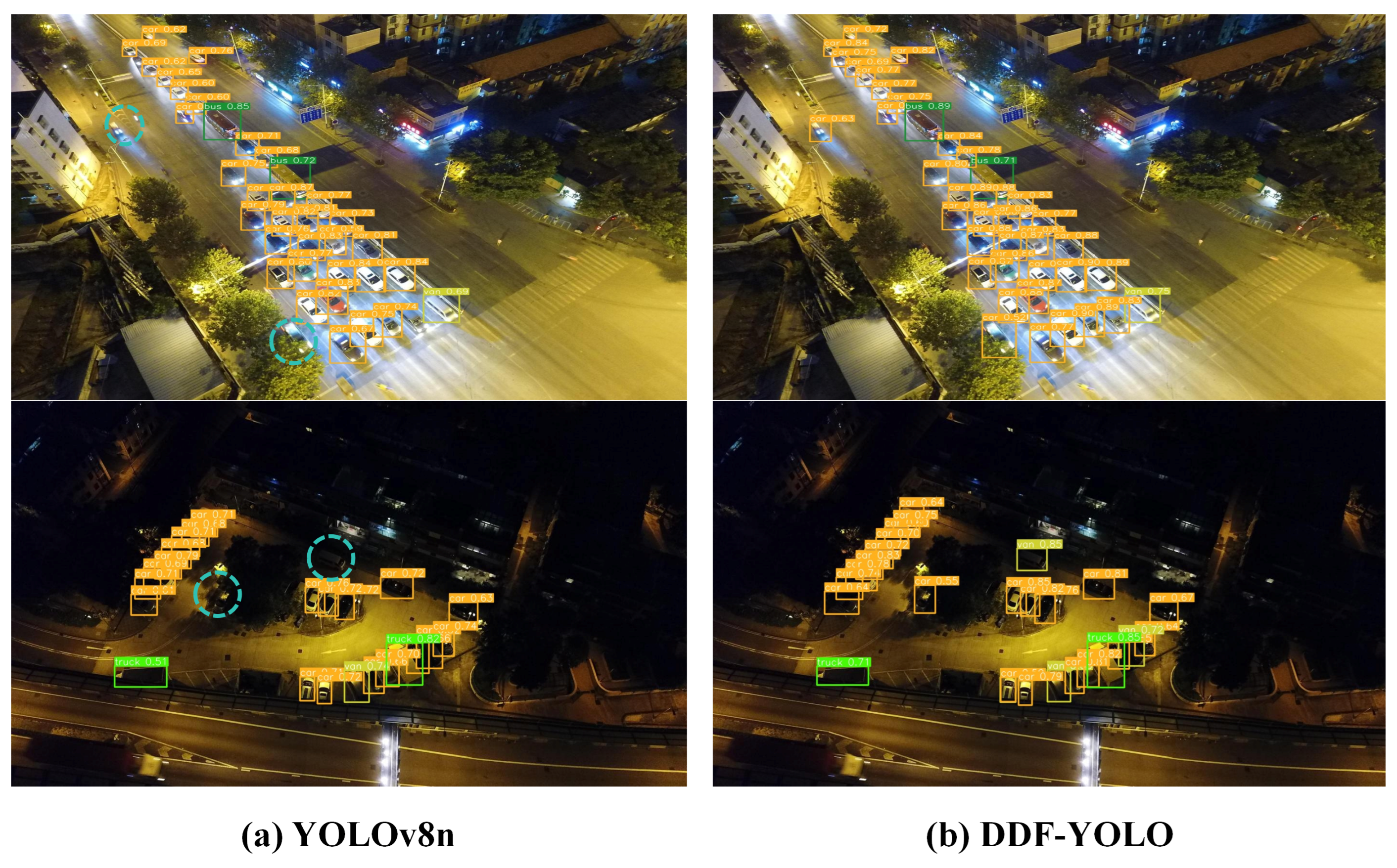 Figure 10 clearly demonstrate that while the conventional YOLOv8n model suffered from nighttime light interference—manifested as false positives (e.g., misidentifying streetlights as vehicles) or complete failure to detect valid targets—our DDF-YOLO model maintained detection accuracy comparable to that achieved under ideal lighting conditions. This comprehensive series of experiments not only verifies DDF-YOLO’s adaptability to complex environmental variations but also provides compelling evidence for its technical feasibility in meeting the requirements of all-weather aerial image detection tasks.