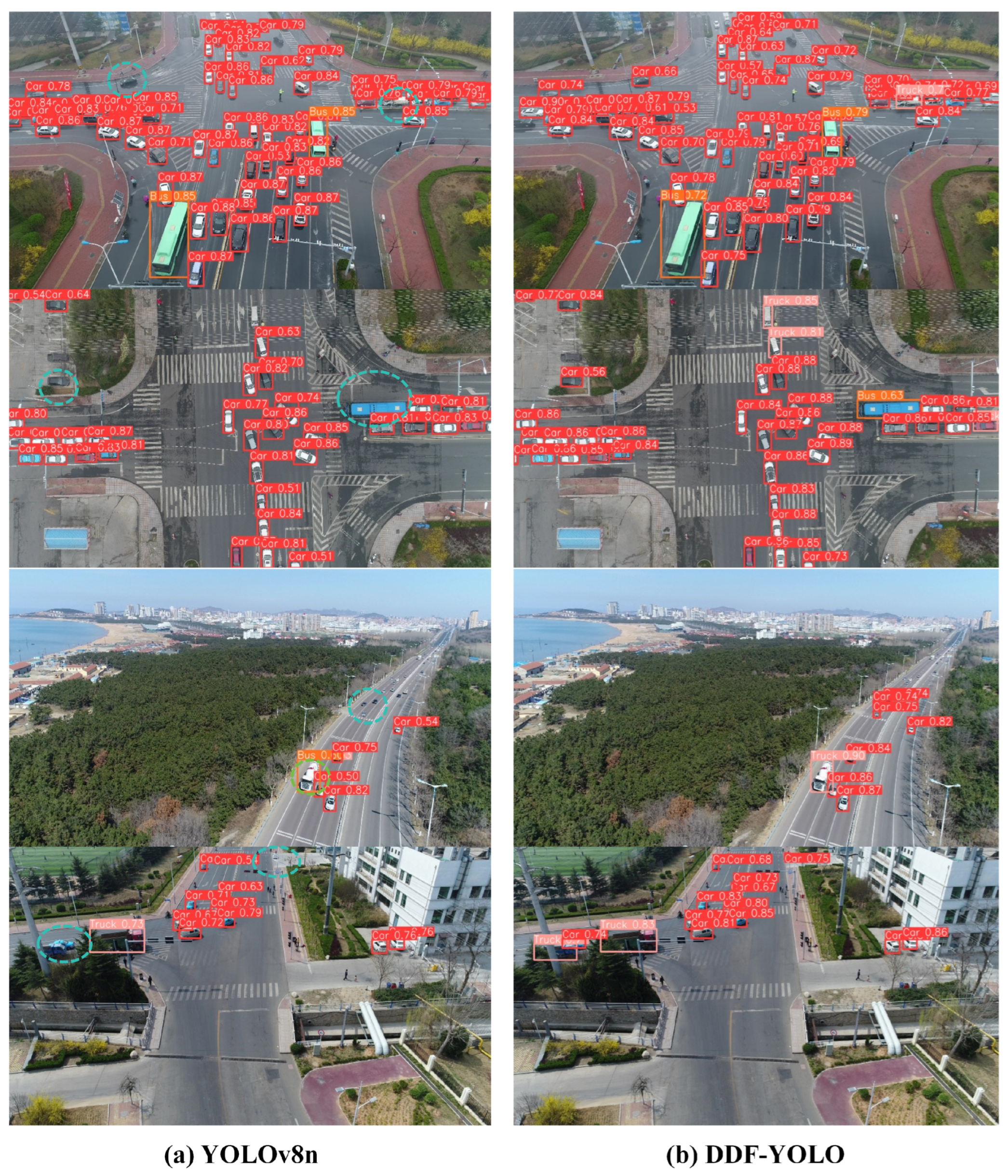 Figure 9, our analysis of detection performance in daytime scenarios (including both rainy and sunny conditions) across typical environments such as urban intersections and suburban roads revealed three primary limitations of the baseline YOLOv8n model: (1) a significant increase in missed detection rates for vehicle targets under low-visibility conditions (e.g., rain and fog); (2) inadequate recognition capability for distant targets captured at large angles; and (3) poor tracking continuity for partially occluded objects. In contrast, our proposed DDF-YOLO model demonstrated substantial performance improvements across these challenging scenarios, particularly exhibiting superior robustness in aerial small object detection tasks.