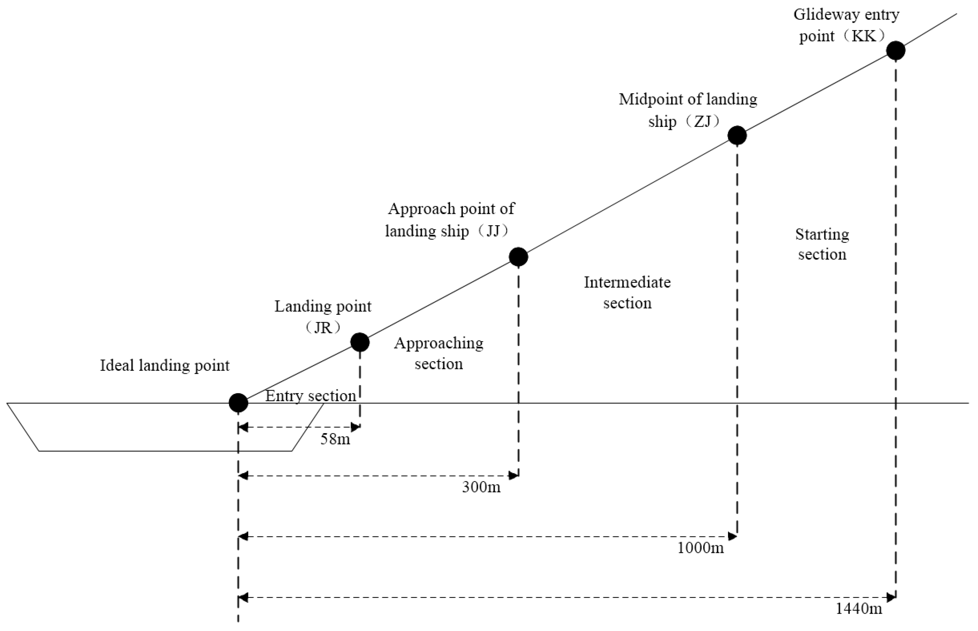 Owing to variability in landing times across different sorties and the use of fixed-interval sensor sampling, variations existed in the data length for each flight. To address this and ensure uniform vector length for model input, the sliding phase was standardized based on the relative distance between the aircraft and key ship positions. Four characteristic points were selected as landmarks for segmenting the landing trajectory: the entry point of the sliding track (KK), the midpoint of the landing path (ZJ), a mid-to-late phase marker (JJ), and the actual touchdown point (JR). These four key assessment points for shipboard landing are illustrated in