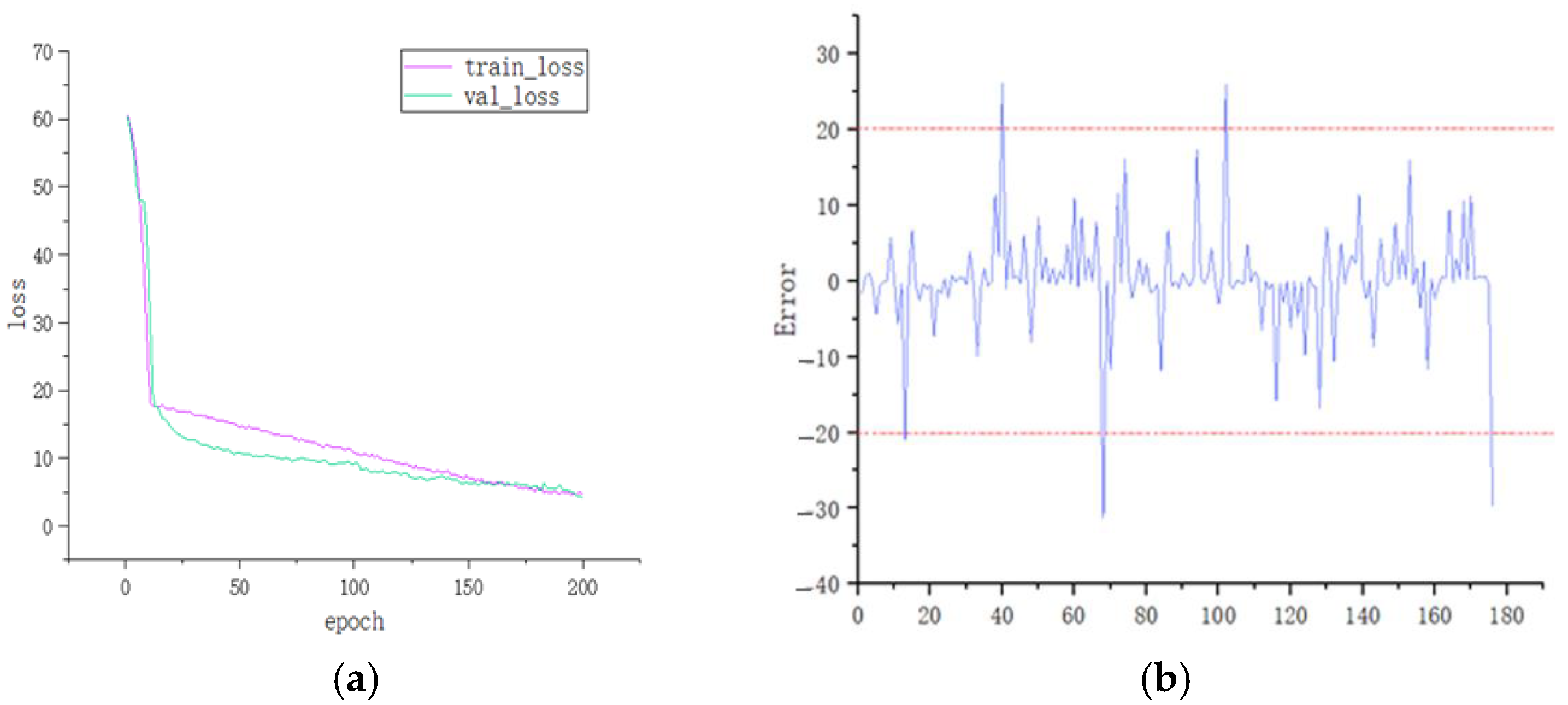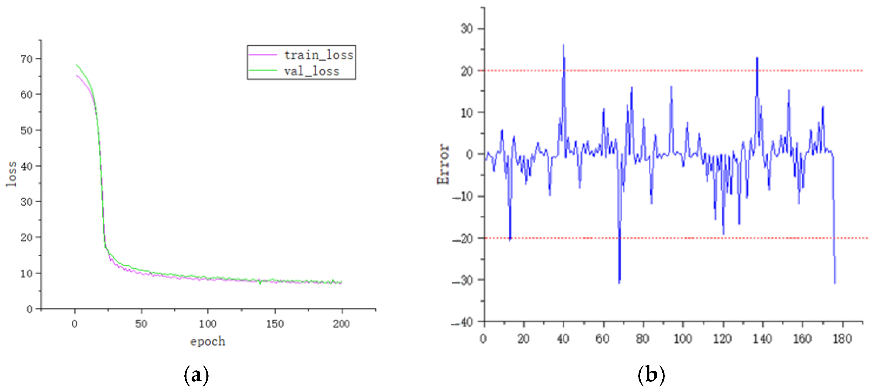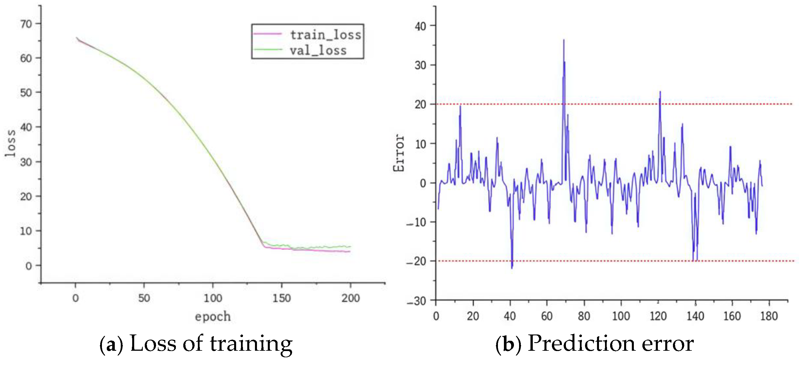 Figure 7. During the training phase, the model loss decreased rapidly within the first 20 epochs, with the rate of decline gradually slowing thereafter. By approximately the 175th epoch, the loss stabilized. In terms of prediction accuracy, 90.9% of the LSTM model’s prediction errors fell within a range of 10. Only 2.27% of the sample errors exceeded 20, indicating slightly better performance than the ANN model. The results for all six input combinations are summarized in