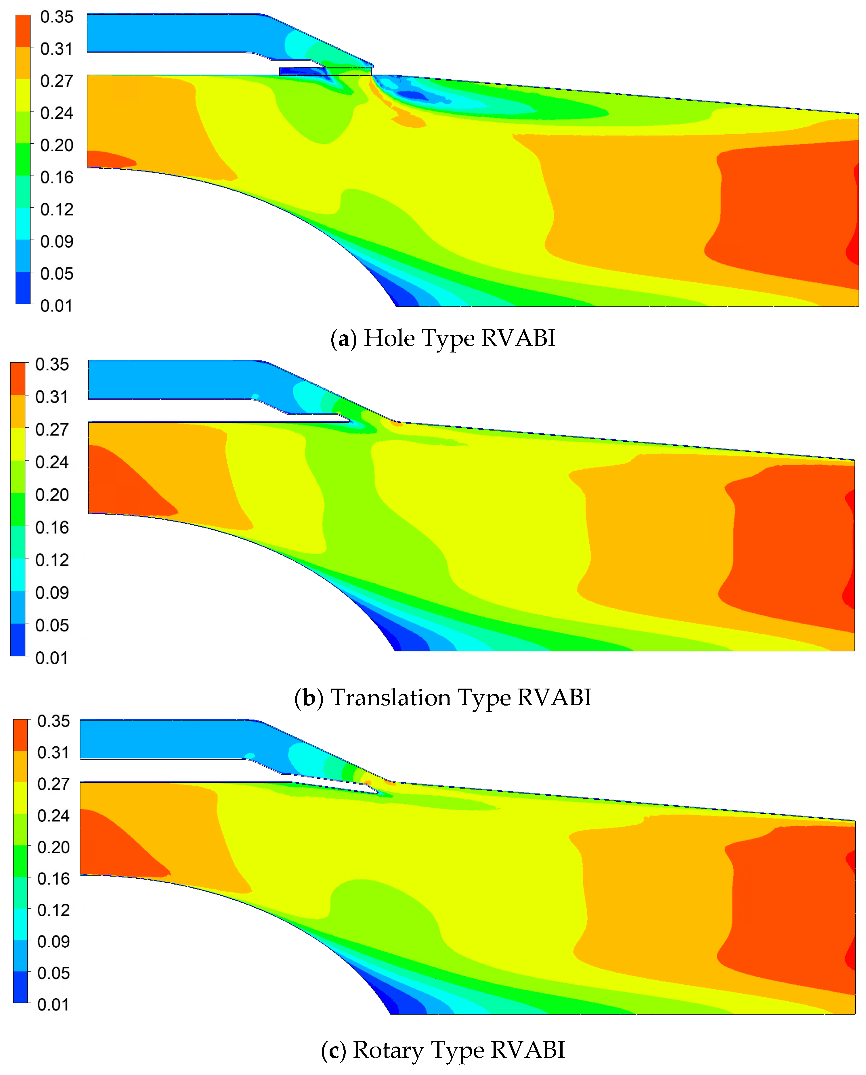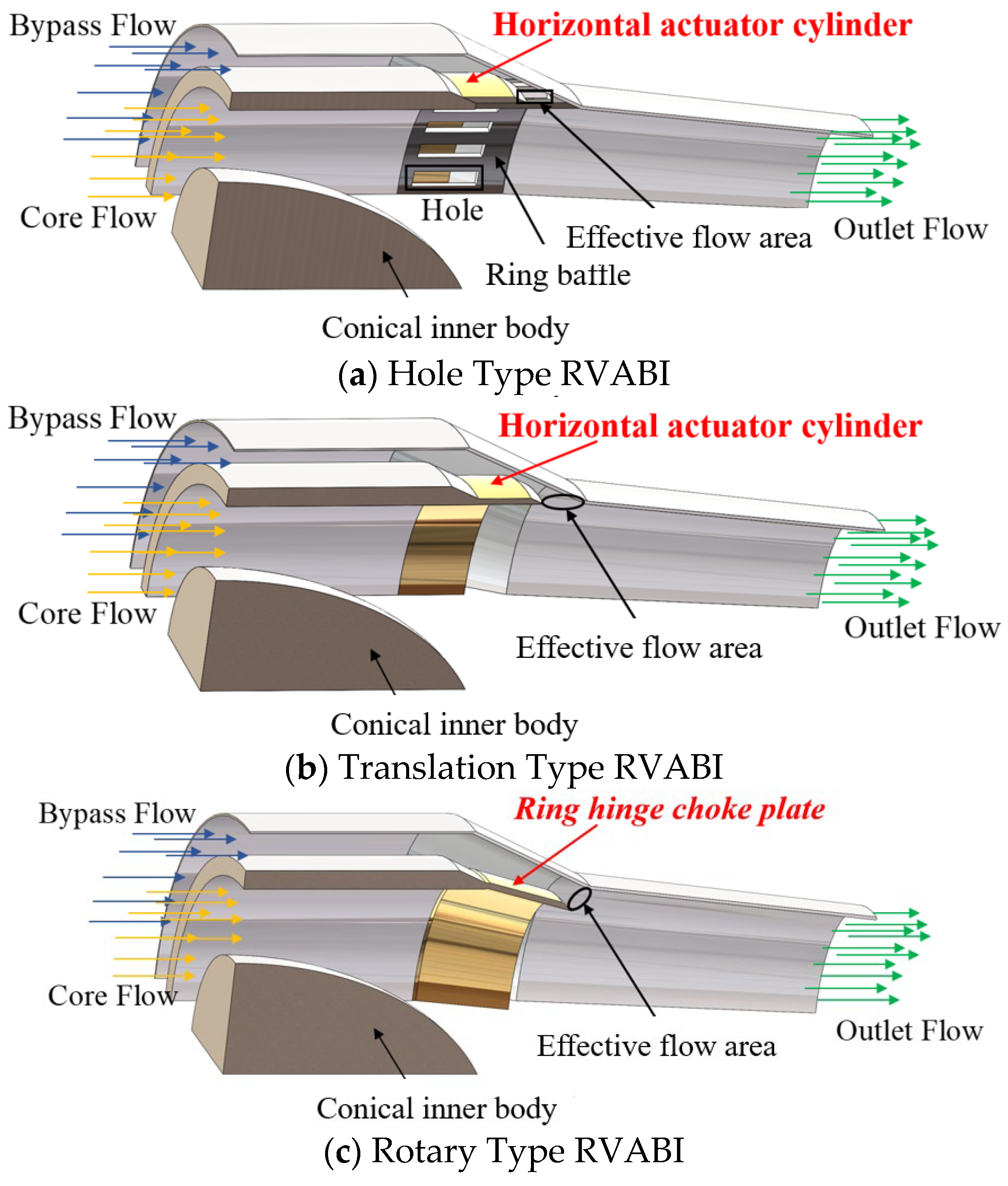- Overall, the thermal mixing efficiency of the Hole Type RVABI is highest among the three configurations, which is well-suited for engines prioritizing compact axial length, high afterburner performance, superior infrared stealth, and low exhaust noise. The total pressure recovery coefficient of the Translation Type RVABI is the highest among the three configurations, which is suitable for the application scenario preferring engine fuel economy. The adjustable range of the bypass ratio of the Rotary Type RVABI is the widest, which is suitable for the application scenario with higher requirements on engine flow regulation capability.