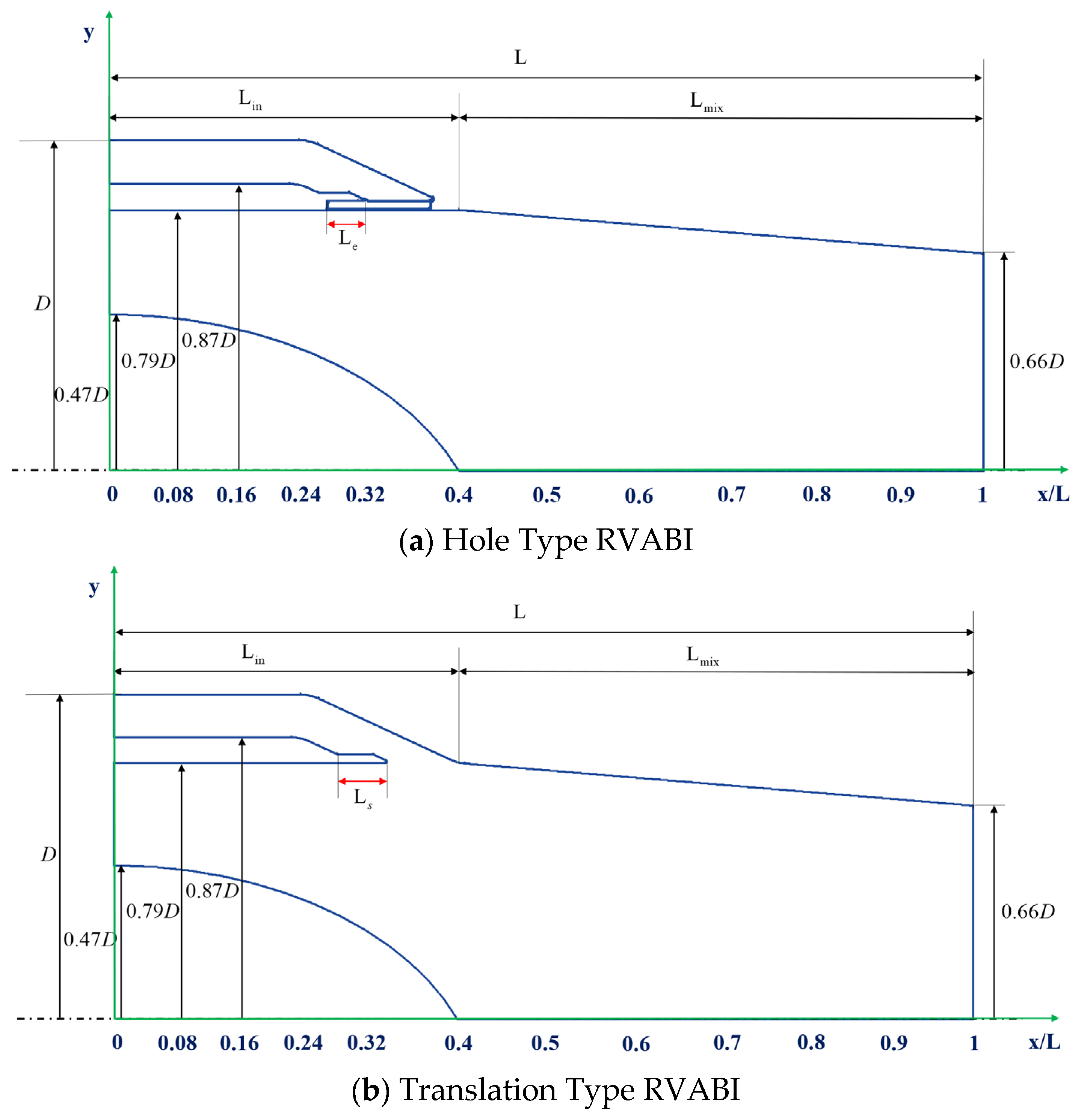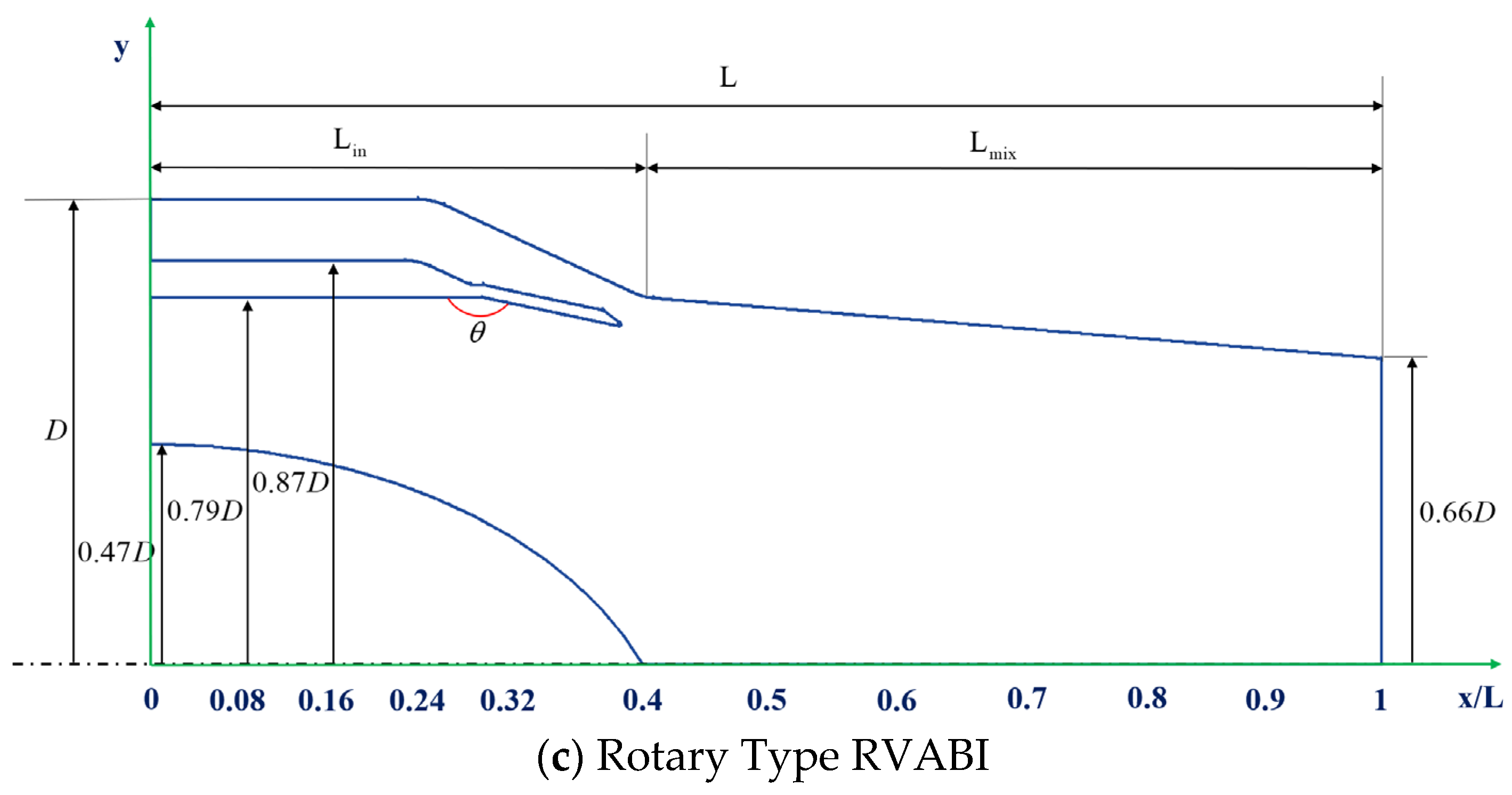 - The external geometric parameters of the three configurations of the RVABI are consistent, including the inlet length Lin, mixing length Lmix, diameter D, etc., of the RVABI.
