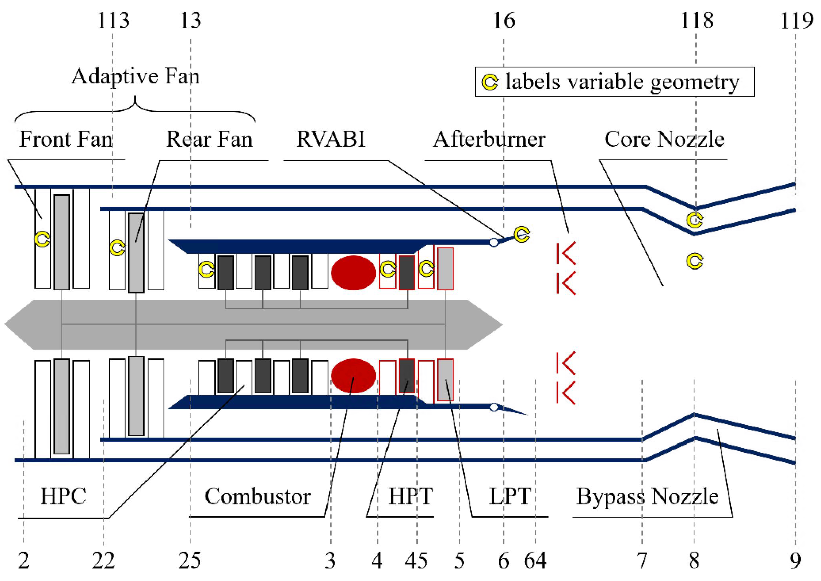- Xu, Z.; Li, M.; Tang, H.; Chen, M. A multi-fidelity simulation method research on front variable area bypass injector of an adaptive cycle engine. Chin. J. Aeronaut. 2022, 35, 202–219. [Google Scholar] [CrossRef]