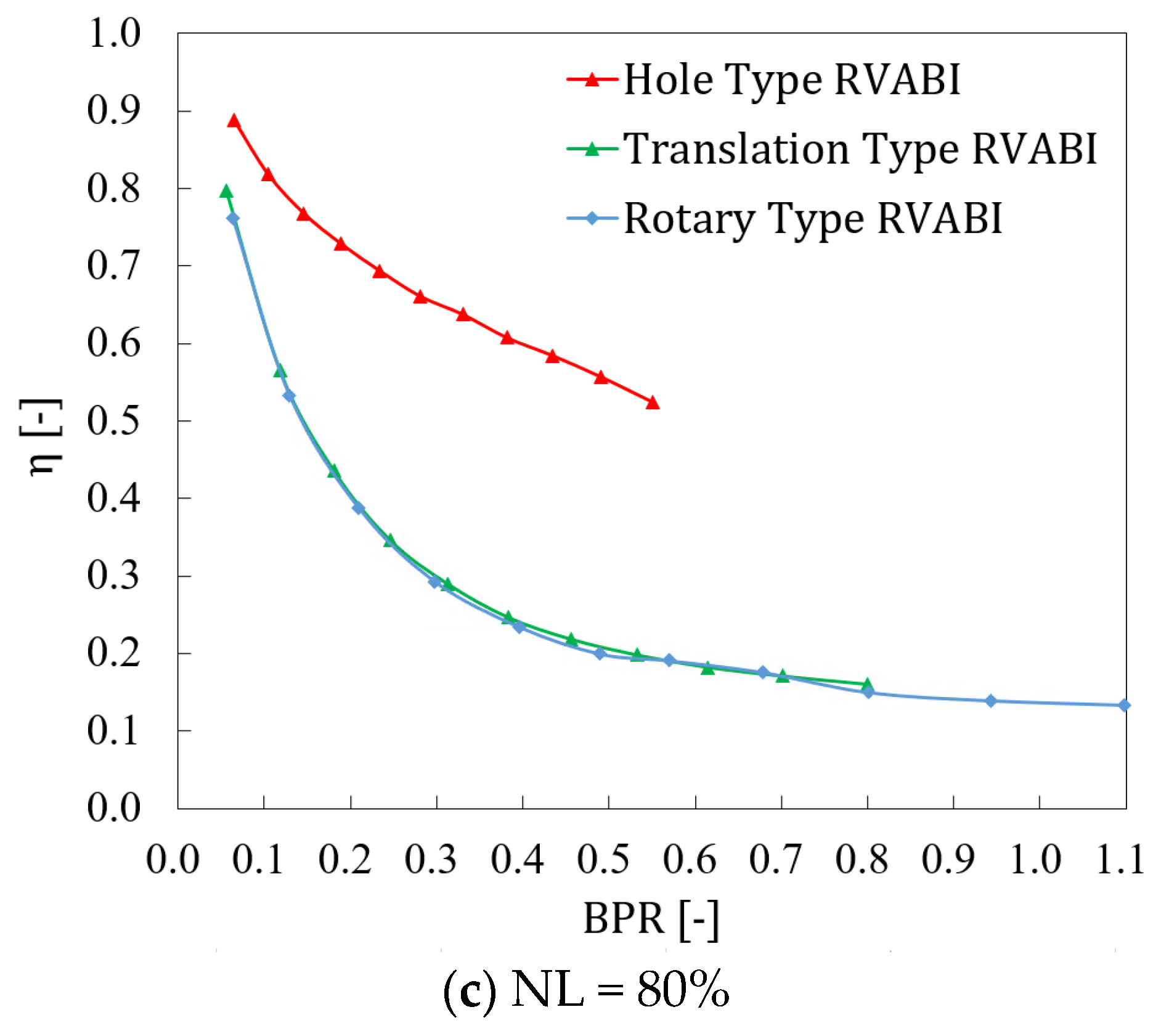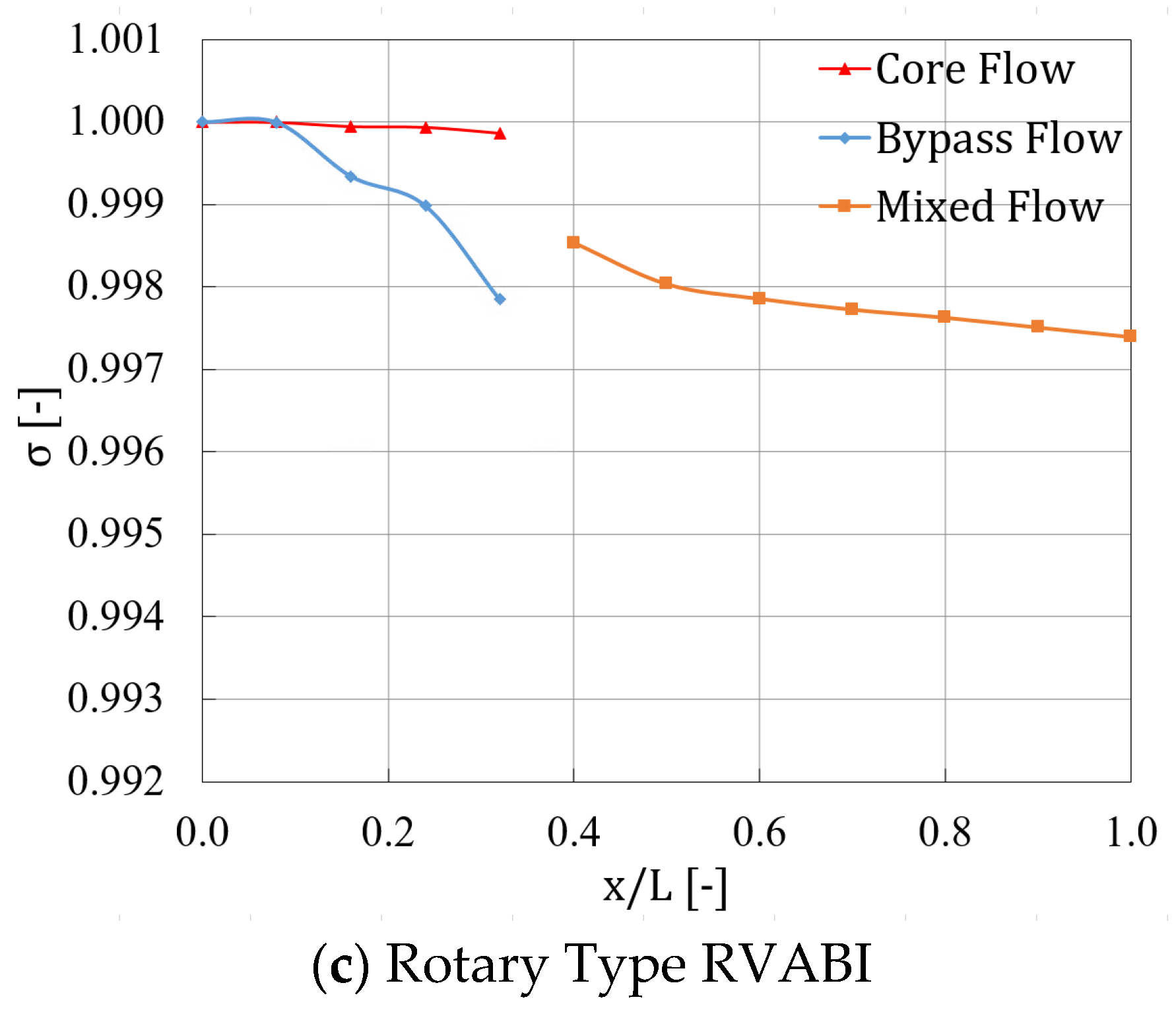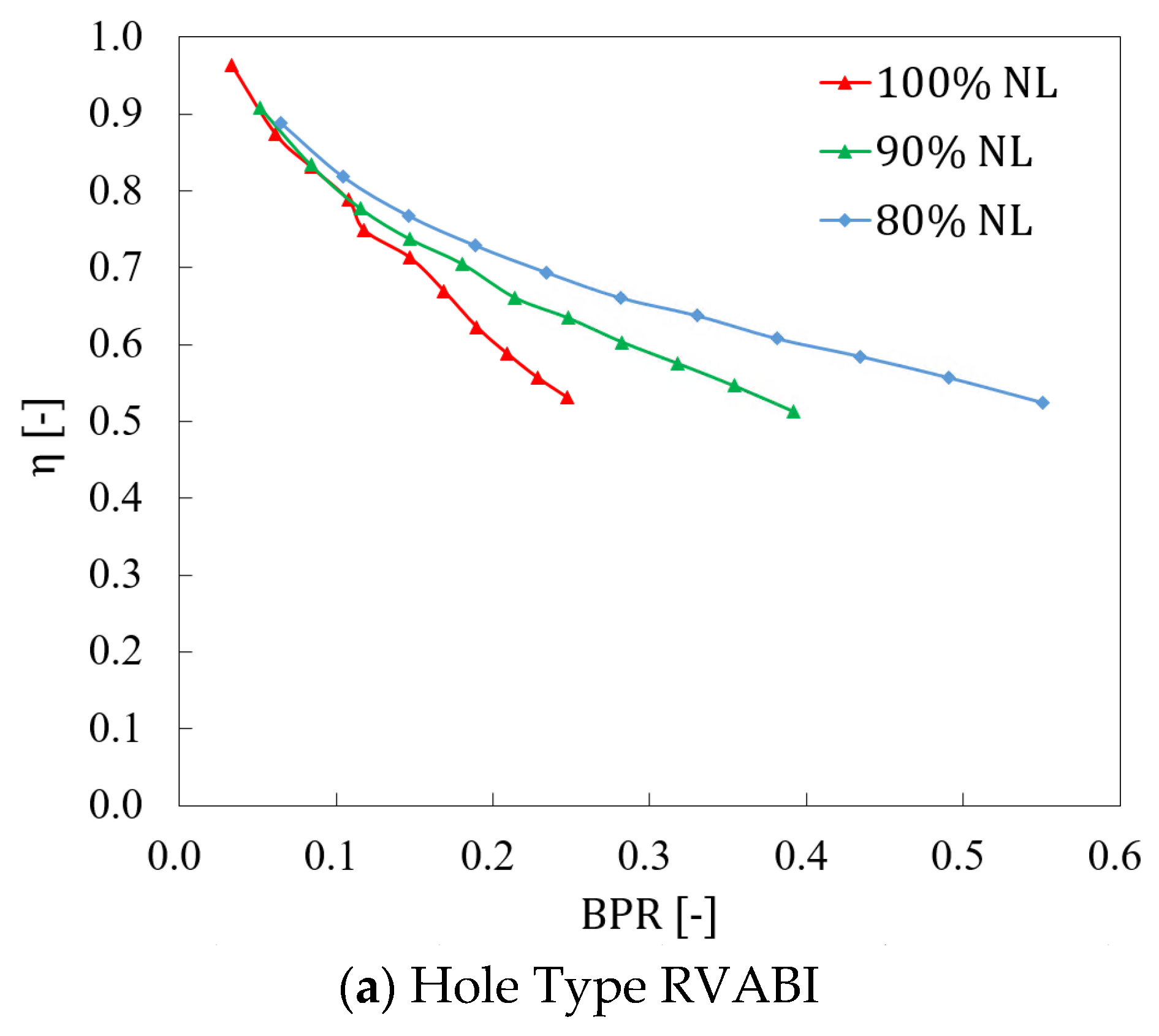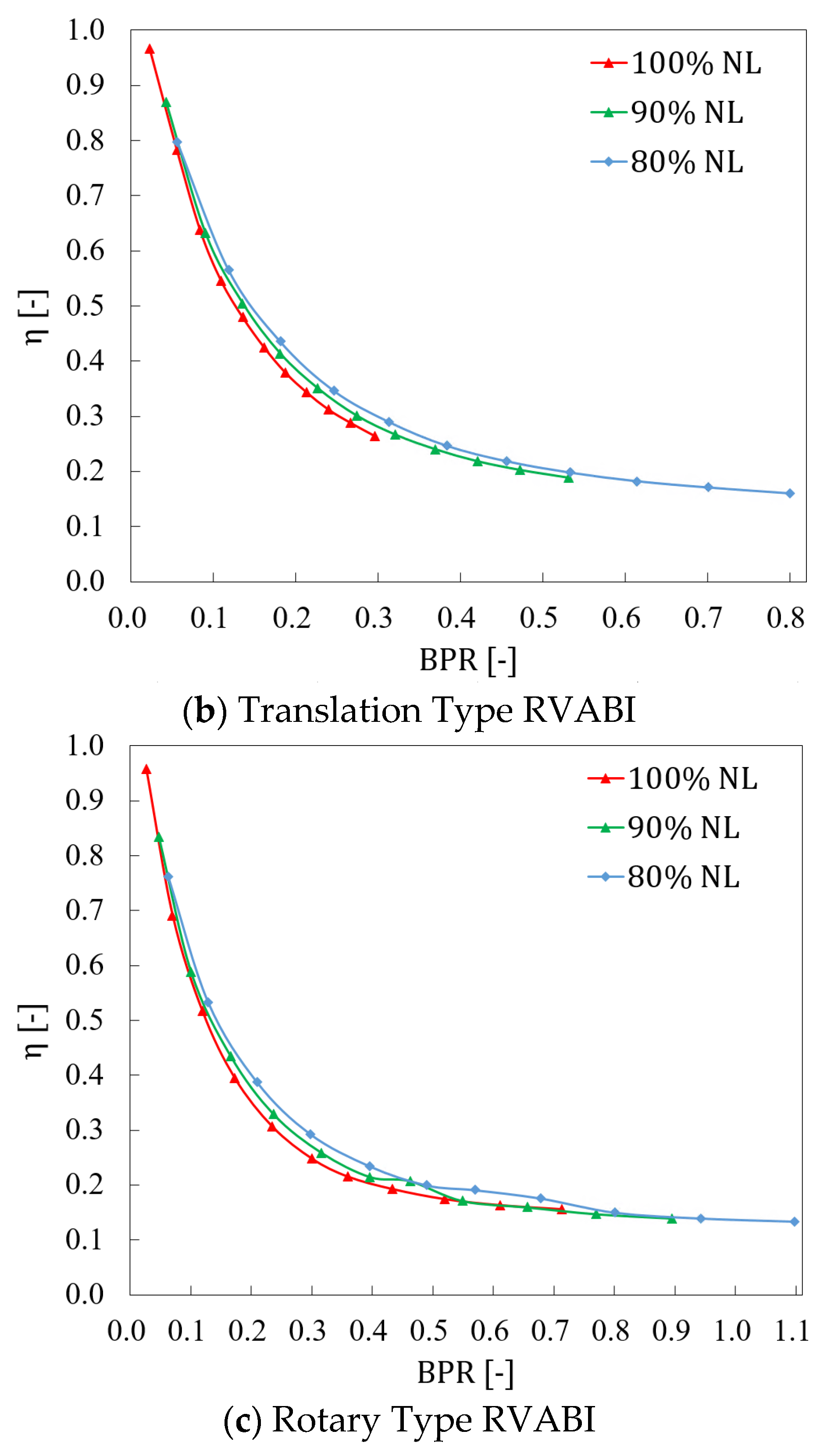 - For the operating conditions at 90% NL of the ACE, both the Translation Type and the Rotary Type RVABIs have approximately 50% lower thermal mixing efficiencies and 0.5% higher total pressure recovery coefficients compared to the Hole Type RVABI. In addition, compared to the Hole Type RVABI, the Translation Type RVABI has a 36% wider adjustable range of bypass ratios and the Rotary Type RVABI has a 128% wider adjustable range of bypass ratios.
