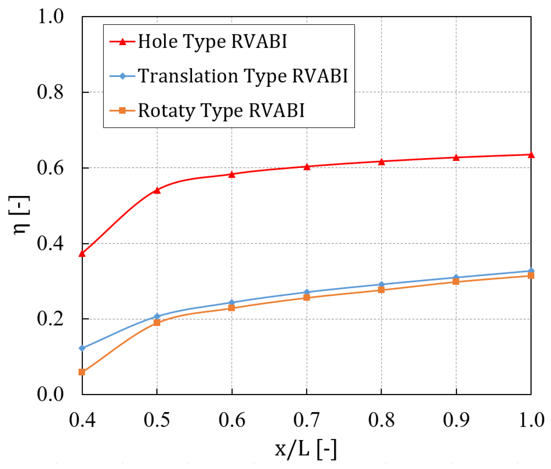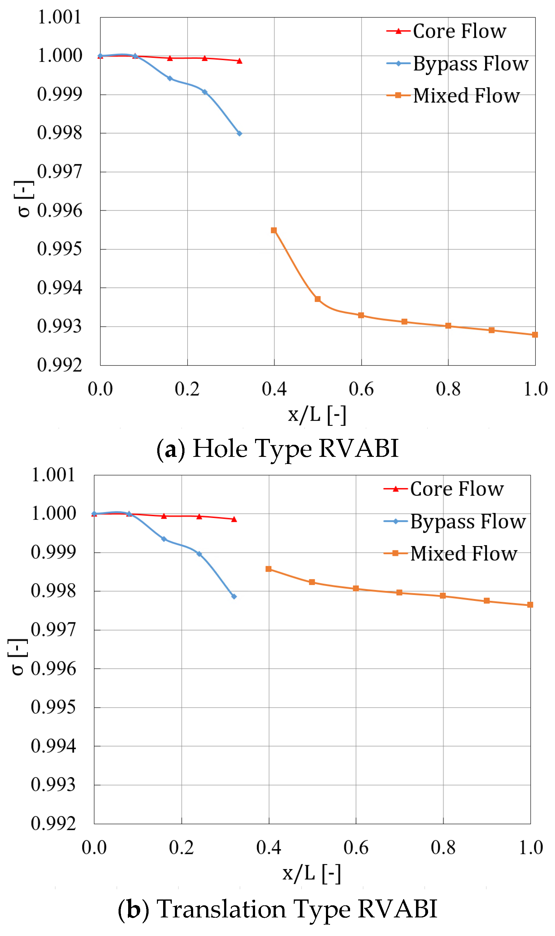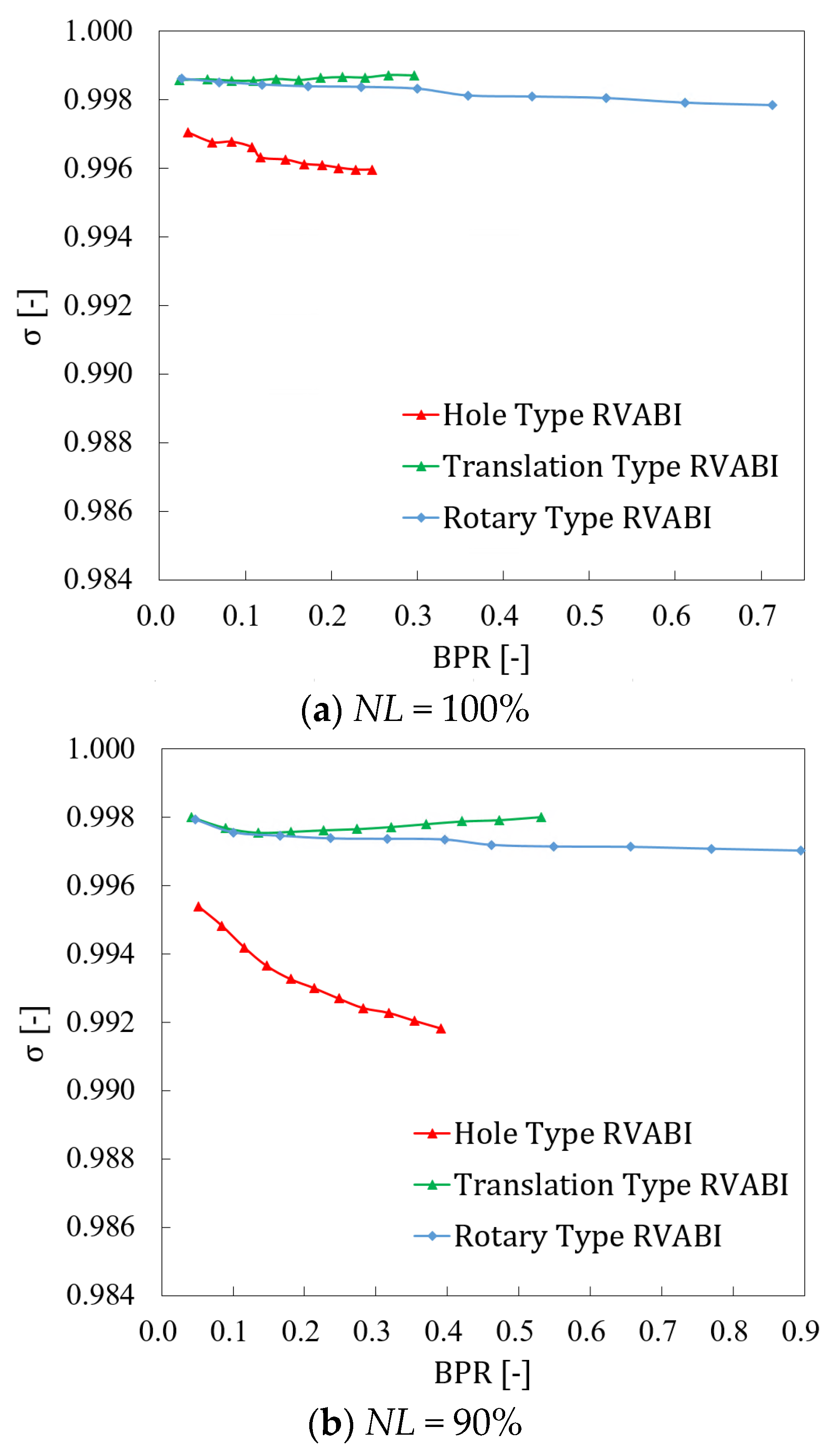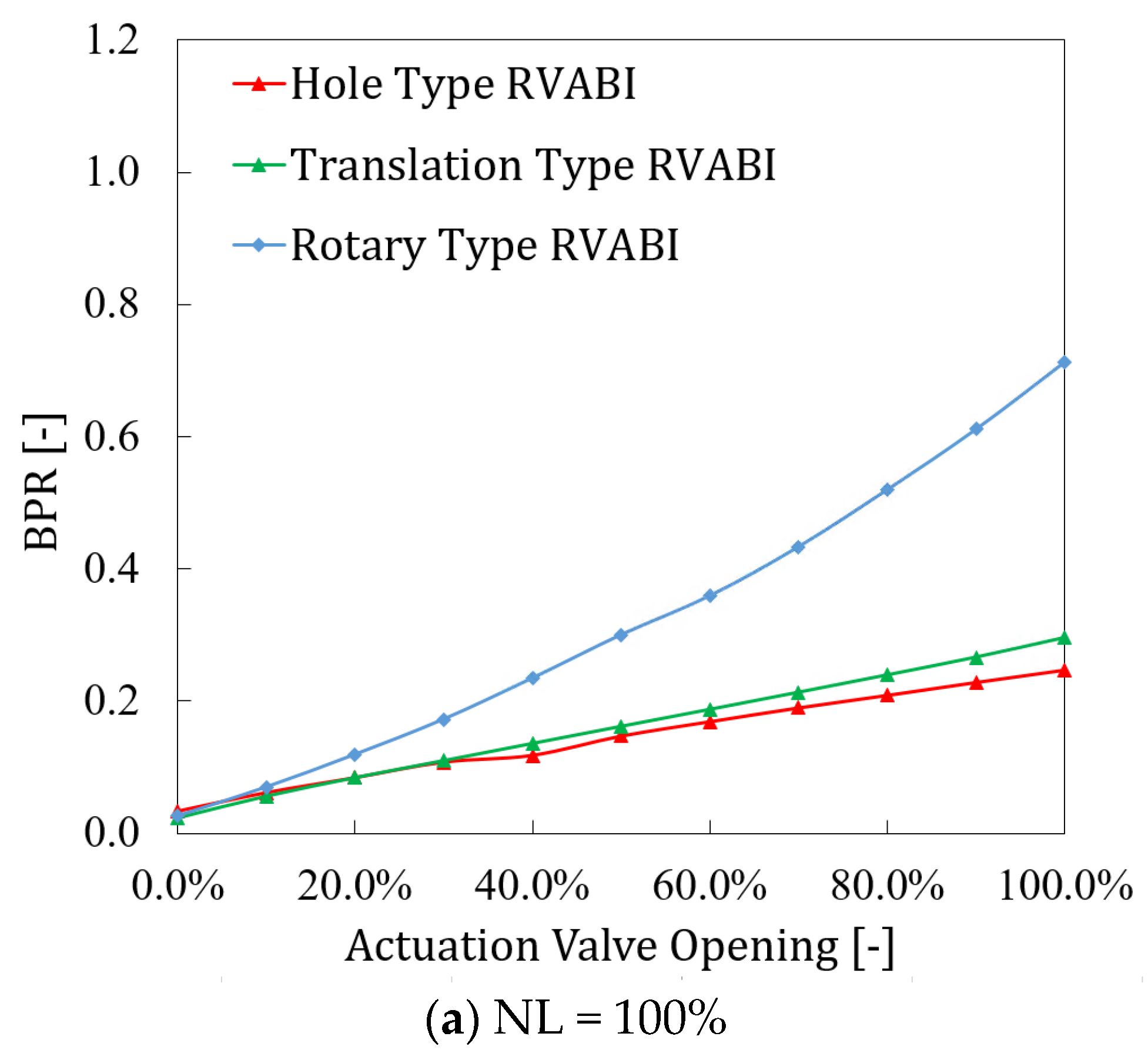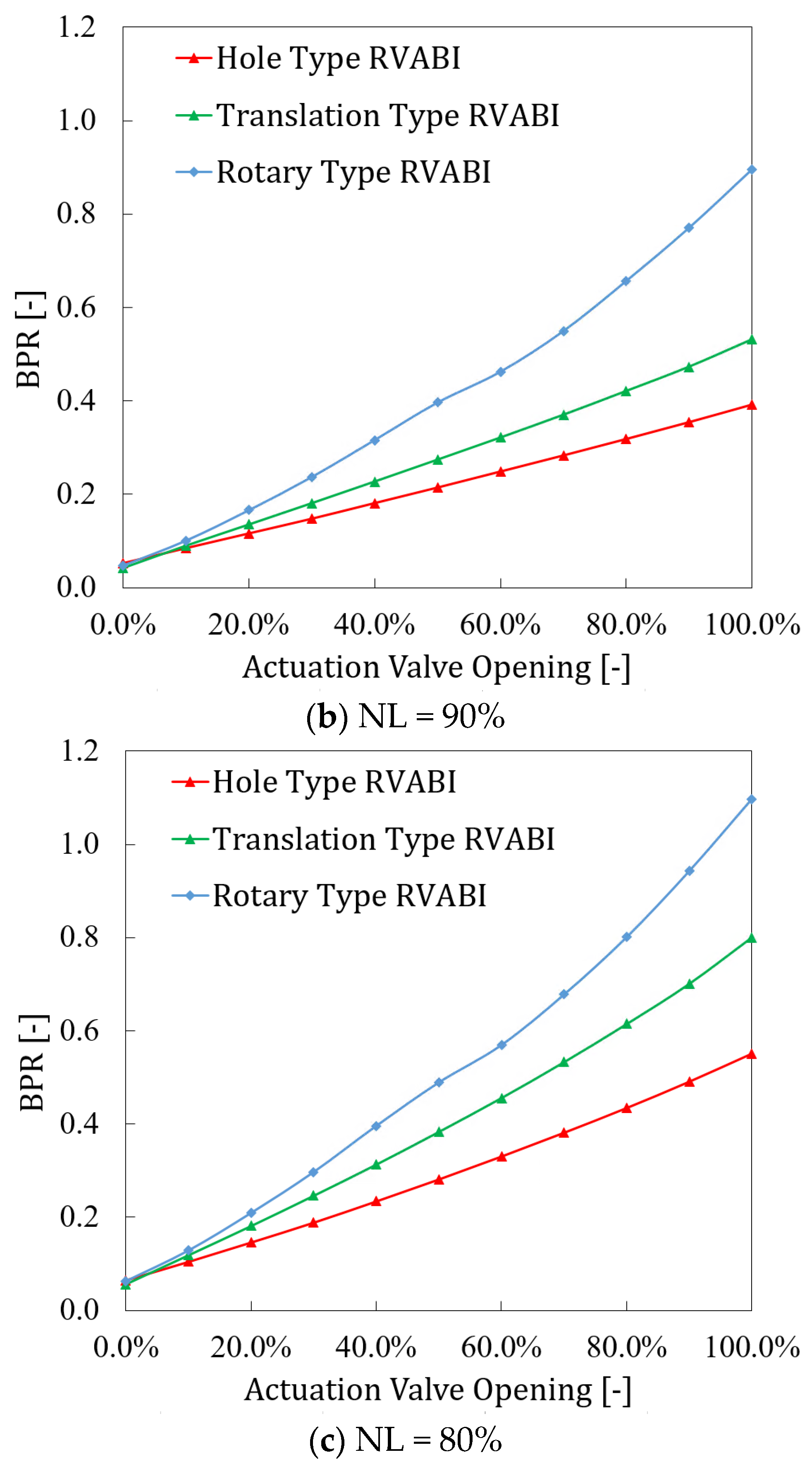 - For the operating conditions at 90% NL of the ACE, both the Translation Type and the Rotary Type RVABIs have approximately 50% lower thermal mixing efficiencies and 0.5% higher total pressure recovery coefficients compared to the Hole Type RVABI. In addition, compared to the Hole Type RVABI, the Translation Type RVABI has a 36% wider adjustable range of bypass ratios and the Rotary Type RVABI has a 128% wider adjustable range of bypass ratios.