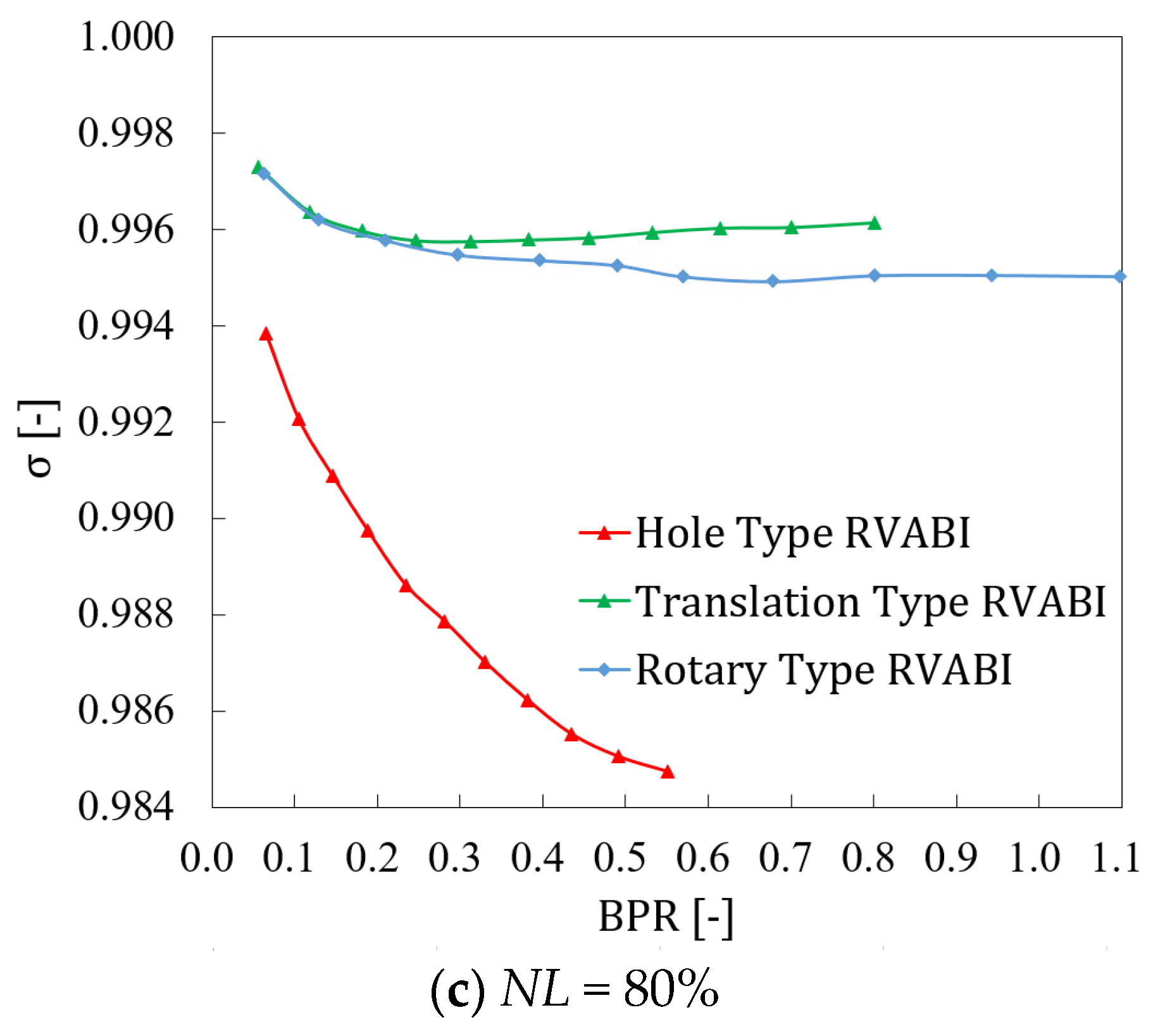 - With the operating condition changed from 100% NL to 80% NL, the adjustable range of the bypass ratio widens for all three configurations of the RVABI. The largest increase in the adjustable range of the bypass ratio was observed for the Translation Type RVABI. The thermal mixing efficiency increases while the total pressure recovery coefficient reduces for all three configurations of the RVABI. Among them, the Hole Type RVABI has the largest increase in thermal mixing efficiency and the largest decrease in total pressure recovery coefficient.