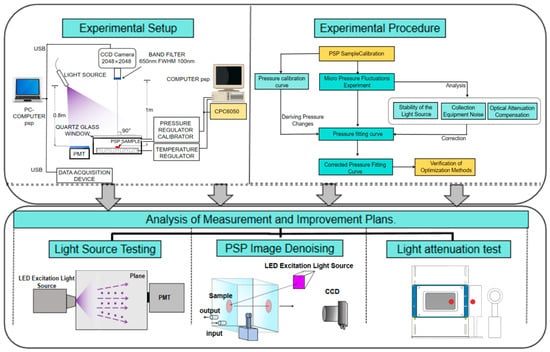 To validate the light-noise attenuation coupled model, this study sequentially analyzed and proposed improvements for the light source, camera, and photodegradation. The enhancement effects before and after processing were compared, and the overall experimental scheme was verified. The pressure system connection diagram and the entire experimental setup are shown in Figure 2. Calibration tests were conducted on PSP samples using two constant PSP samples from the same batch. The samples used platinum (II) meso-tetra (pentafluorophenyl) porphyrin as the luminous molecule, with a polymer as the main component of the binder and dichloromethane as the main solvent. The temperature was controlled and kept at room temperature. The pressure scanning sequence was absolute pressure 50–75–100–125–150 kPa. Under different pressure conditions, a continuous and stable excitation light source was used to irradiate the PSP samples. The excitation light source was a high-precision stabilized LED placed approximately 1 m vertically from the calibration box to ensure uniform and stable excitation light on the sample surface. Nine images (with a 650 nm band-pass filter) were shot continuously with a scientific CCD camera. In the experiment, 100 kPa was selected as the reference pressure, and the corresponding gray value was selected as the reference gray value. The Stern–Volmer equation was used to fit the collected gray value and pressure value, and the sensitivity parameters were obtained. Simultaneously, a photomultiplier tube (PMT) was placed parallel to the calibration box to monitor the stability of the light source. During the experiment, both the PSP sample and the PMT were positioned at the center of the excitation light to avoid edge light collection by the PMT, thereby ensuring the accuracy of the measurement results []. A CCD camera was used to capture the luminescence intensity, with the camera fixed at an appropriate distance from the calibration box, at a 90° angle and along the central axis, to ensure the accuracy and consistency of the images.