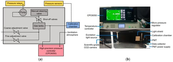 The calibration chamber measures 156 mm × 105 mm, with a semiconductor heating/cooling element on the outer side of the base plate and embedded temperature sensors to measure the temperature of the PSP sample. The chamber is equipped with gas pipelines connected to the outside, linked to a Kamoer pressure/vacuum pump to achieve internal pressure regulation and measurement, with a pressure regulation range of 9 kPa–251 kPa in absolute pressure. An optical viewport is designed on the calibration box for illumination by the excitation light source and collection of fluorescence images. The temperature regulation unit has a temperature control accuracy of 0.009 °C and a control range of 5–60 °C, meeting the strict temperature requirements for experimental environments. The principle of pressure control connection is shown in Figure 2. Pressure regulation is achieved through a relay controlling the air pump switch, manual directional valve, and high-pressure air provided by a gas storage tank, with the pressure sensor displaying the current pressure value. After incorporating a high-precision modular pressure controller (CPC6050), the control accuracy can reach 0.01% within the gauge pressure range of ±17 kPa, with the control accuracy for this experiment being approximately 3.4 Pa.