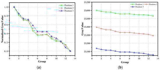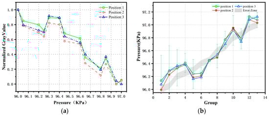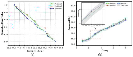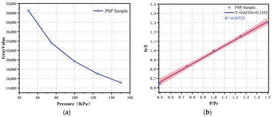 (a) Normalized data of light attenuation of PSP reference samples; (b) Gray value of PSP reference sample.
