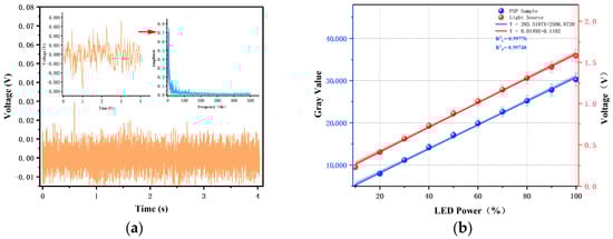 In order to analyze the light source and obtain specific data about the influence of light source on the image gray value and pressure error, this study manually adjusted the light source power from 10% to 100%, measured and recorded the gray-scale values of the samples under different powers, and plotted the fitted curve of gray-scale values versus light source intensity (see the right-hand side of Figure 6). Concurrently, by adjusting the light source power and capturing images, the gray-scale values of the images and the measurement data from the photomultiplier tube (PMT) were synchronously obtained (see the left-hand side of Figure 6). The purpose of this was to check the relationship between the gray value of the PSP sample and the PMT data. As can be seen from Figure 6b, there is a good linear relationship between the gray value of the sample and PMT data; that is, the fitting curve rises and falls at the same time, and from the PMT data, we can determine the change in the gray value of the sample caused by the light source.