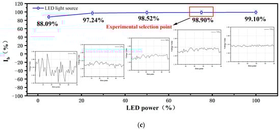 In this study, the light source data were averaged over a specific period, with the duration of this process matched to the exposure time of the scientific-grade CCD camera []. The UV-LED excitation light source used in the experiment was positioned 1 m away from the PSP sample. Under thermal equilibrium conditions, the light source exhibited poor stability when operating at low power, which significantly impacted the fluctuations in the gray-scale values of the captured images, thus necessitating an analysis of light source fluctuations []. A PMT was employed to collect the light source signal and determine its maximum frequency. Using the PMT with a sampling frequency set at 1000 Hz, the light source signal was collected, with the results shown in Figure 6a. After applying median filtering, the variations in the signal became evident. The light source signal was then subjected to a fast Fourier transform (FFT). As can be seen from the Figure 6a, most of the energy is concentrated in the low-frequency region, particularly between 0 and 50 Hz. This indicates that the light source fluctuations are primarily composed of low-frequency components. With increasing frequency, the amplitude rapidly decreases, suggesting that high-frequency components are relatively scarce and that the maximum frequency of the light source is 8.3 Hz, which means that the sampling frequency can fully capture the light source signal. It can be seen from the experimental data in Figure 6c that the stability of the light source increases with the increase in the light source power. Especially in the range of increasing the power of the light source from 5% to 25%, the most remarkable enhancement of the stability of the light source is noticed. If the power exceeds 25%, the further increase in power will produce diminishing returns in terms of stability improvement. Although the closer to full power, the higher the stability, it can be seen from the data that 75% power is very close to 99% power stability, and in the case of 75% power, the gray value range of the image is more appropriate, and excessive light source power will lead to the gray value of the image in a higher area. Therefore, considering the safety and reliability of the experiment, follow-up research is carried out with a light source power of 75%.