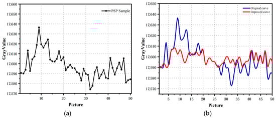 Therefore, the combination of histogram matching and wavelet transform, leveraging the complementary strengths of both methods, further optimized the gray-scale consistency of the images. Specifically, histogram matching first adjusted the gray-scale distribution of the images to reduce the global gray-scale differences between them. The wavelet transform then further smoothed the high-frequency fluctuations and local inconsistencies in the images through multi-scale decomposition. The combination of these two methods more effectively eliminated the gray-scale fluctuations between the images. Applying the aforementioned methods to the images in the minor pressure fluctuation test experiment aimed to reduce the gray-scale fluctuations in the PSP images, thereby improving the quality of the images.