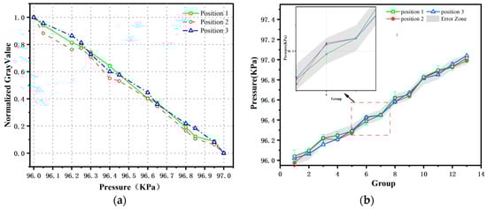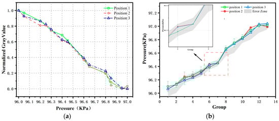 Herein, represents the reference pressure. Owing to the particularity of light compensation under minor pressure fluctuations, a detailed discussion is presented in the subsequent sections. To correct for the photodegradation phenomenon under minor pressure fluctuations, this study proposes a dynamic light compensation method based on the attenuation ratio, thereby enhancing the accuracy and consistency of measurements. We use a spatially unified light attenuation compensation method instead of pixel-by-pixel compensation. We generate an average image by regional pixel-level average of multiple images collected under the same pressure and calculate a uniform attenuation percentage based on the overall gray change in the image. Specifically, by comparing the changes in gray values measured before and after, we quantitatively analyze the influence of light attenuation, and then apply it to the whole image for compensation. The core concept of this compensation method is to precisely estimate the degree of photodegradation by calculating the percentage change in gray-scale values for each measurement image and to use this estimate as a correction factor. This factor is then applied to subsequent measurements by dynamically adjusting the gray-scale values of the current measurement images, thereby compensating for gray-scale fluctuations caused by attenuation. This method can effectively avoid the problem of local noise amplification that may be caused by pixel-by-pixel compensation while maintaining the overall consistency of the image, and is suitable for scenes with a high signal-to-noise ratio in their micro-pressure measurement. Specific instructions are as follows: