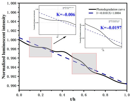 In PSP measurement, the light attenuation of coatings is related to its own attenuation rate. The error between light attenuation and PSP pressure measurement can be described by Formula (8), where is the attenuation percentage, which will be described in detail below. Given that photodegradation cannot be overlooked in experiments involving minor pressure fluctuations, the photodegradation rate of the pressure-sensitive paint (PSP) is defined as the rate of change in luminous intensity under reference pressure, denoted as [].