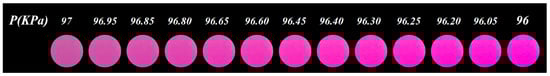To address the photodegradation characteristics during minor pressure fluctuations, a dynamic light compensation method based on the attenuation ratio was employed. This compensation method effectively minimizes the interference of photodegradation effects on the experimental results, allowing the gray-scale changes in the images to more accurately reflect pressure variations. Figure 13 illustrates the changes in the PSP sample. Figure 14 shows the comparison of the PSP image gray-scale values and pressure fitting curves before and after photodegradation compensation. The results indicate a significant improvement in the agreement between the compensated PSP-measured pressure data and the pressure data displayed by the sensor, demonstrating the effectiveness of the compensation measures. Additionally, the data show that during minor pressure fluctuation measurements, the measurement error of PSP was effectively controlled within 50 Pa.