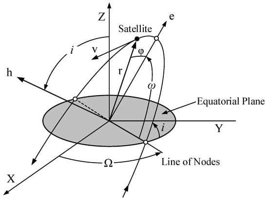 Under Earth’s gravitational influence, satellites orbit the Earth’s center of mass at specific velocities. Except for geostationary satellites, other satellites cannot remain fixed directly above a single point on the Earth’s surface. Their coverage areas change dynamically over time, a behavior strictly governed by parameters such as orbital altitude and inclination. Therefore, a single satellite generally cannot meet the monitoring requirements for medium- and high-orbit space targets. Given that satellite motion in orbit follows certain temporal and spatial patterns, collaborative operations using multiple satellites can achieve broader regional coverage and enhance coverage characteristics over specific areas. This ensures that target regions are monitored according to mission-specified time intervals or coverage frequency. The basic orbital parameters of a satellite are illustrated in Figure 2, and these parameters will be described in detail in the following section.