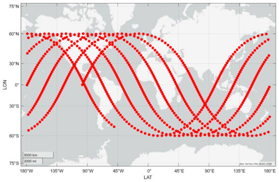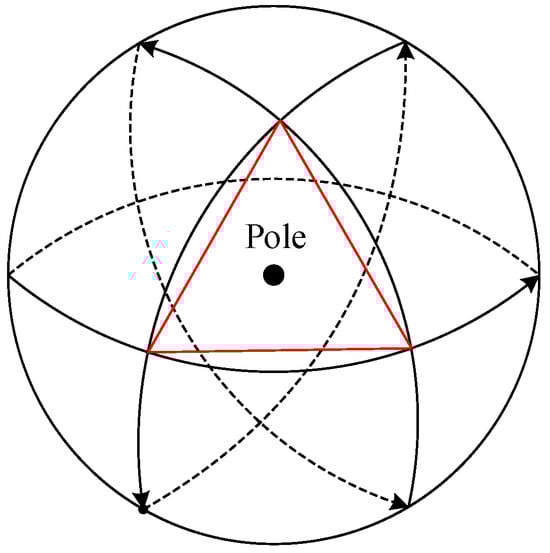 The Walker constellation configuration is a type of inclined symmetric circular-orbit satellite constellation, proposed by John Walker of the British Aerospace Corporation. This configuration includes two special forms: the Delta pattern and the Rosette pattern [27,28]. Among these, the Walker-Delta constellation, as the classical form, consists of three satellite orbital planes. When viewed from the direction of the polar axis, the ground track intersections of the satellites in each orbital plane form a pattern resembling the Greek letter Delta (Δ), as illustrated in Figure 3.