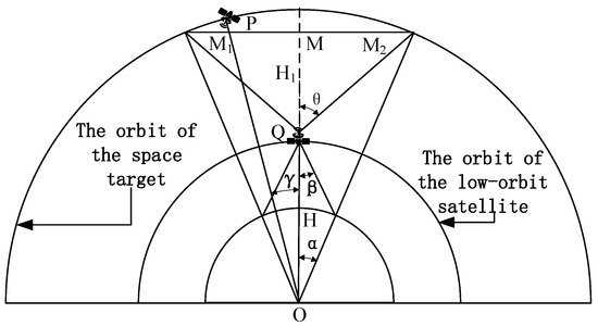 When designing a low-Earth orbit (LEO) satellite constellation for monitoring medium- and high-orbit space objects [30], its primary task is to efficiently observe these targets to support critical missions such as space situational awareness and debris avoidance. During the detection of space objects, LEO satellites operate against the backdrop of deep space. To simplify the modeling, the optical axis of the sensor payload on the LEO satellites is assumed to be aligned along the geocentric radial direction (pointing away from the Earth’s center). Their detection range is illustrated in Figure 4.