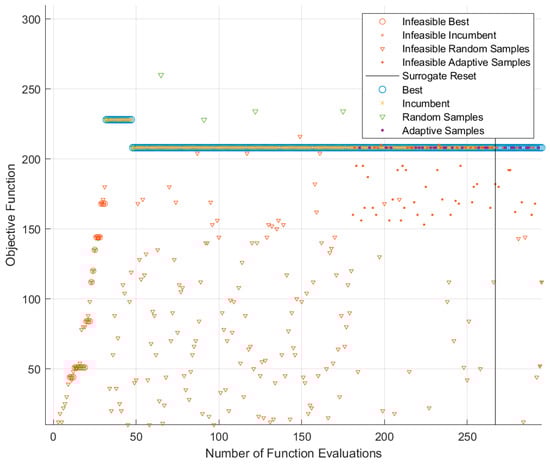 The optimization algorithm exhibited a highly efficient convergence profile. The global optimum was first located at the 46th iteration. The subsequent iterations served to validate the robustness of this solution and refine the surrogate model in its vicinity. The “surrogate reset” mechanism was systematically triggered at iteration 269, a consequence of the search having concentrated sufficiently around the optimum without finding improvements. This sequence of events—rapid discovery followed by sustained validation and a final convergence check—underscores the reliability of the final parameters presented in Table 3.