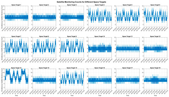 Figure 10 clearly depicts the coverage status of each space object over the entire simulation period. Detailed analysis of the simulation data indicates that the designed LEO satellite constellation achieves 100% continuous coverage for all targets throughout the entire simulation period. Moreover, at any given time, each space object is simultaneously covered by at least three LEO satellites, fully satisfying the requirements for multi-satellite collaborative surveillance. A schematic diagram of the simulation scenario is presented in Figure 11.