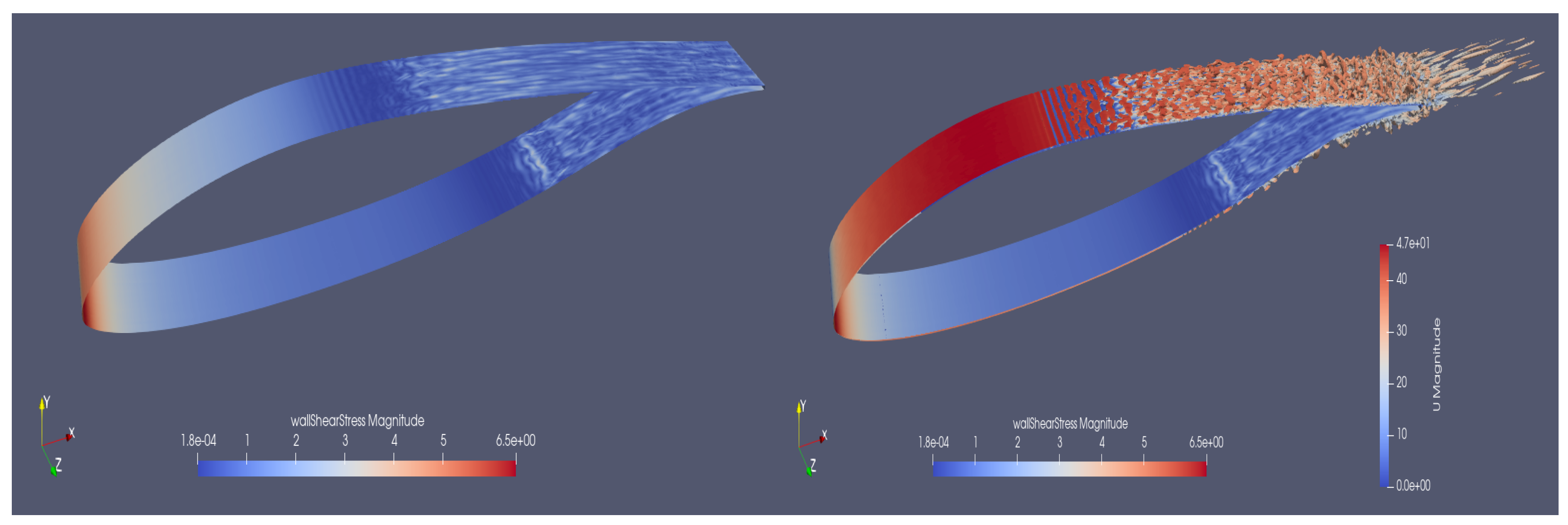 - Shur, M.L.; Spalart, P.R.; Strelets, M.K.; Travin, A.K. A hybrid RANS-LES approach with delayed-DES and wall-modelled LES capabilities. Int. J. Heat Fluid Flow 2008, 29, 1638–1649. [Google Scholar] [CrossRef]