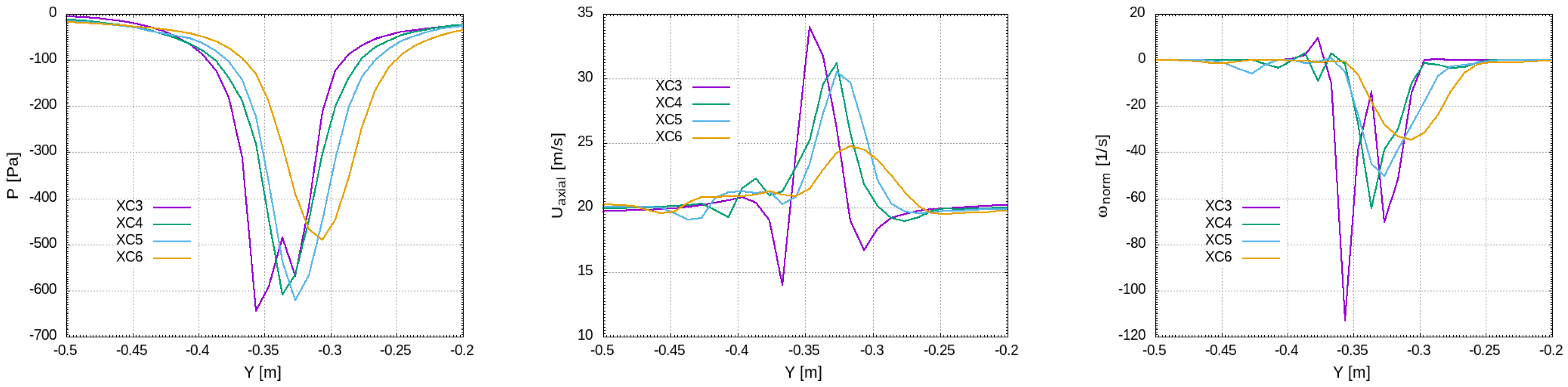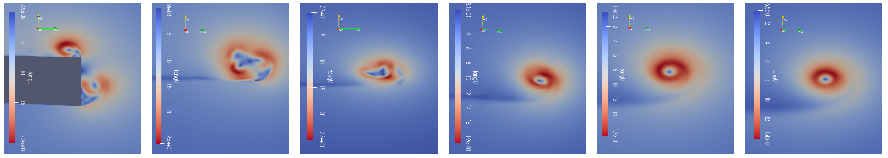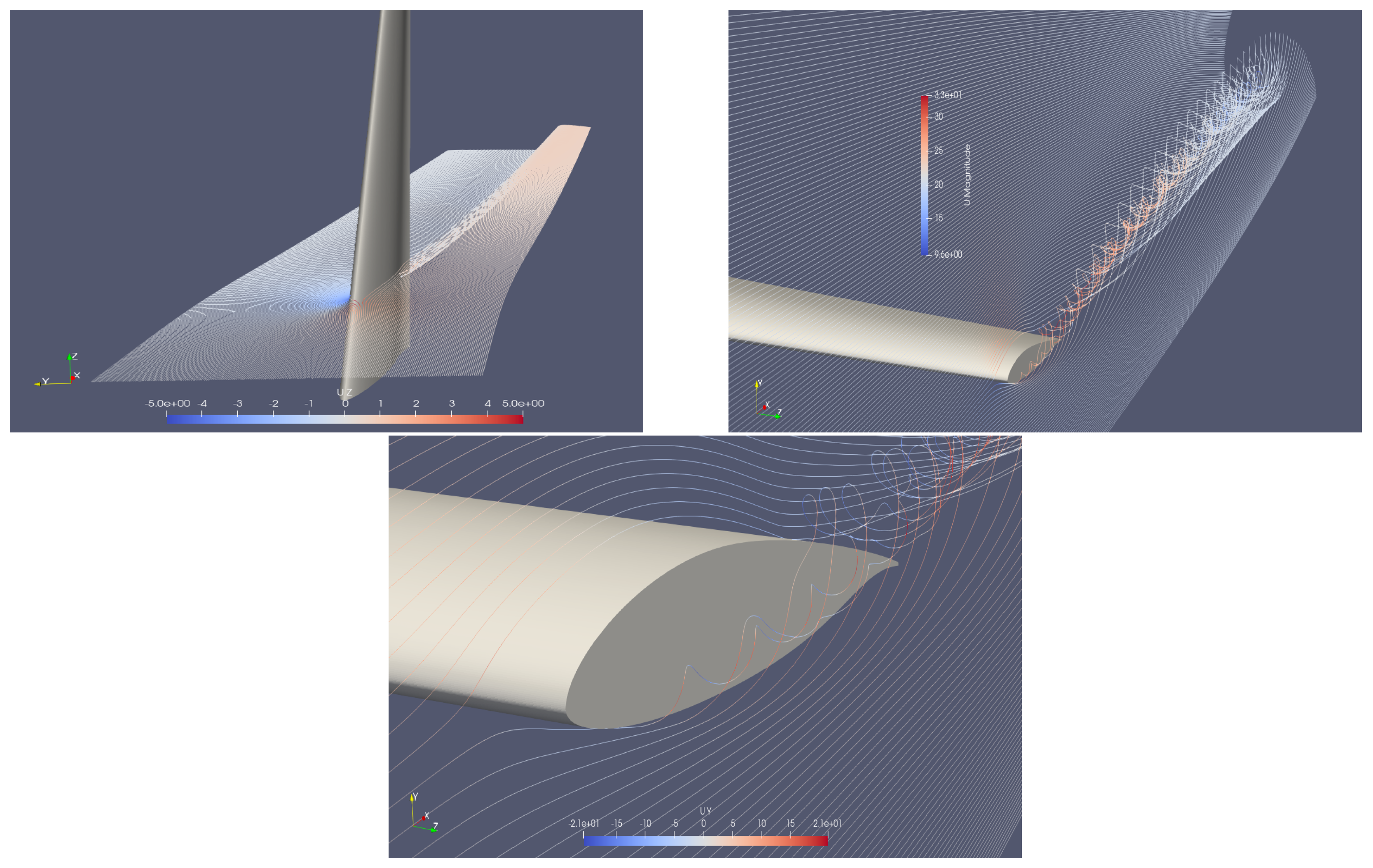 - By the flat wing tip, the boundary initially detaches at the two tip corners, and thus, two shear layers are formed which subsequently roll up and merge to form a coherent vortex. This mechanism leads to a tip vortex with significant axial velocity surplus, e.g., , which diminishes downstream, i.e., an almost full recovery of the freestream flow is achieved at a cross-plane two chords downstream of the wing. The WTV also exhibits a straight, instead of a meandering, trajectory.