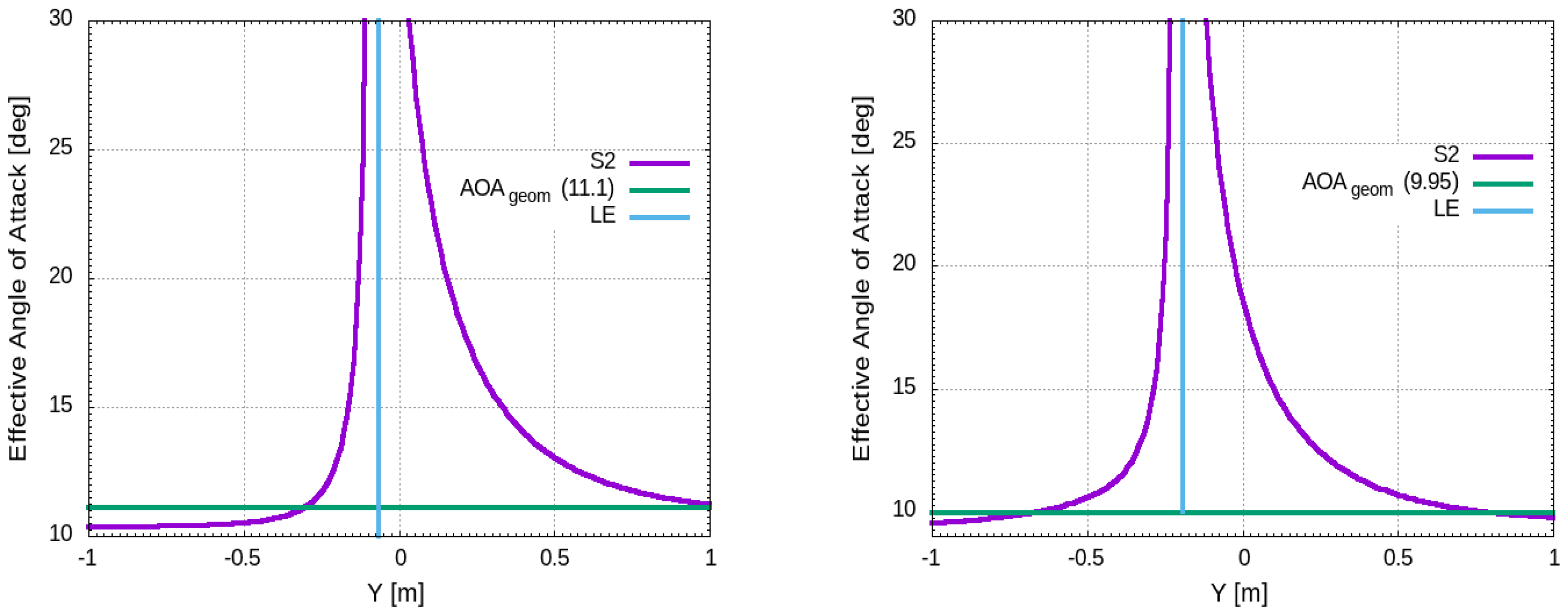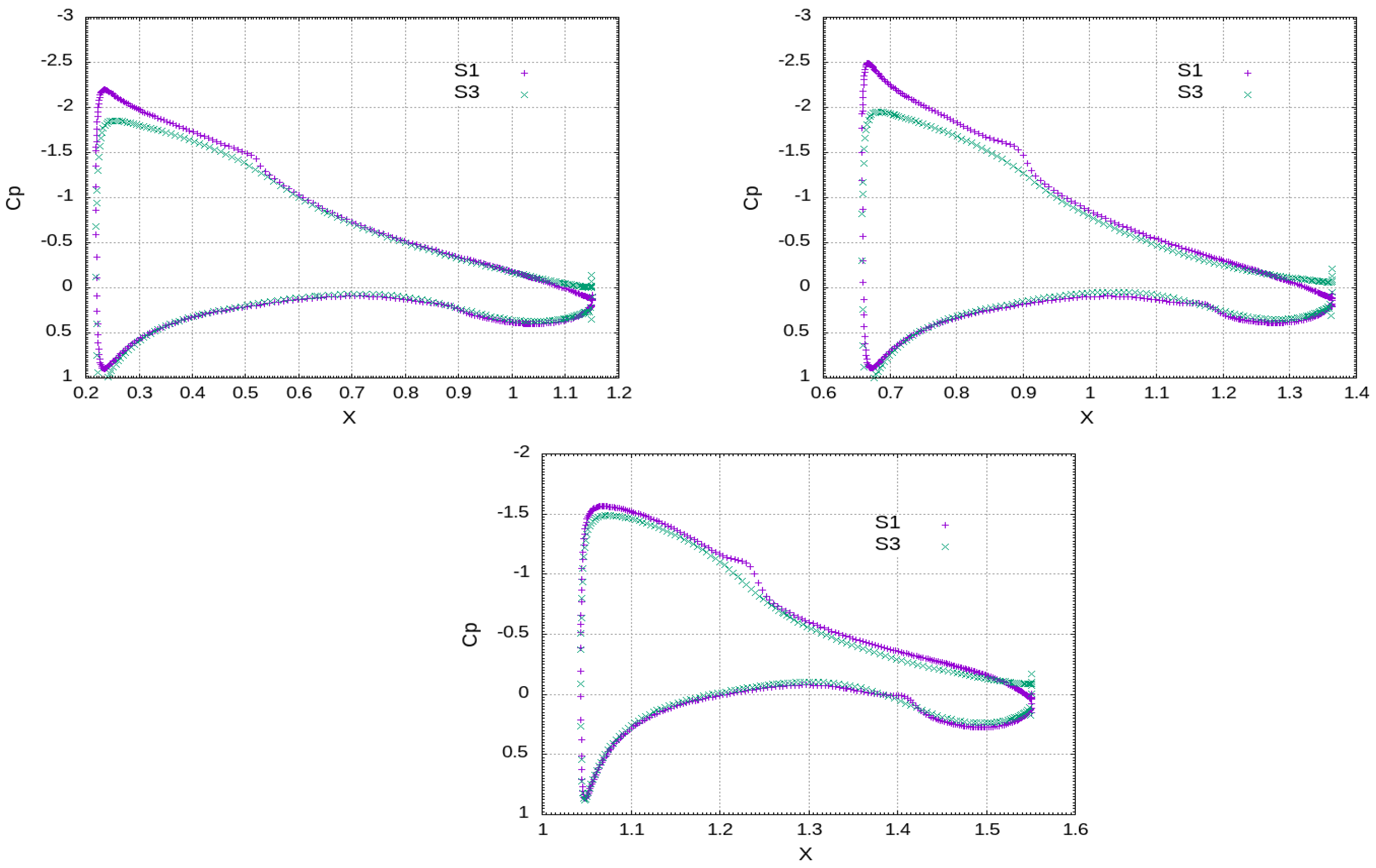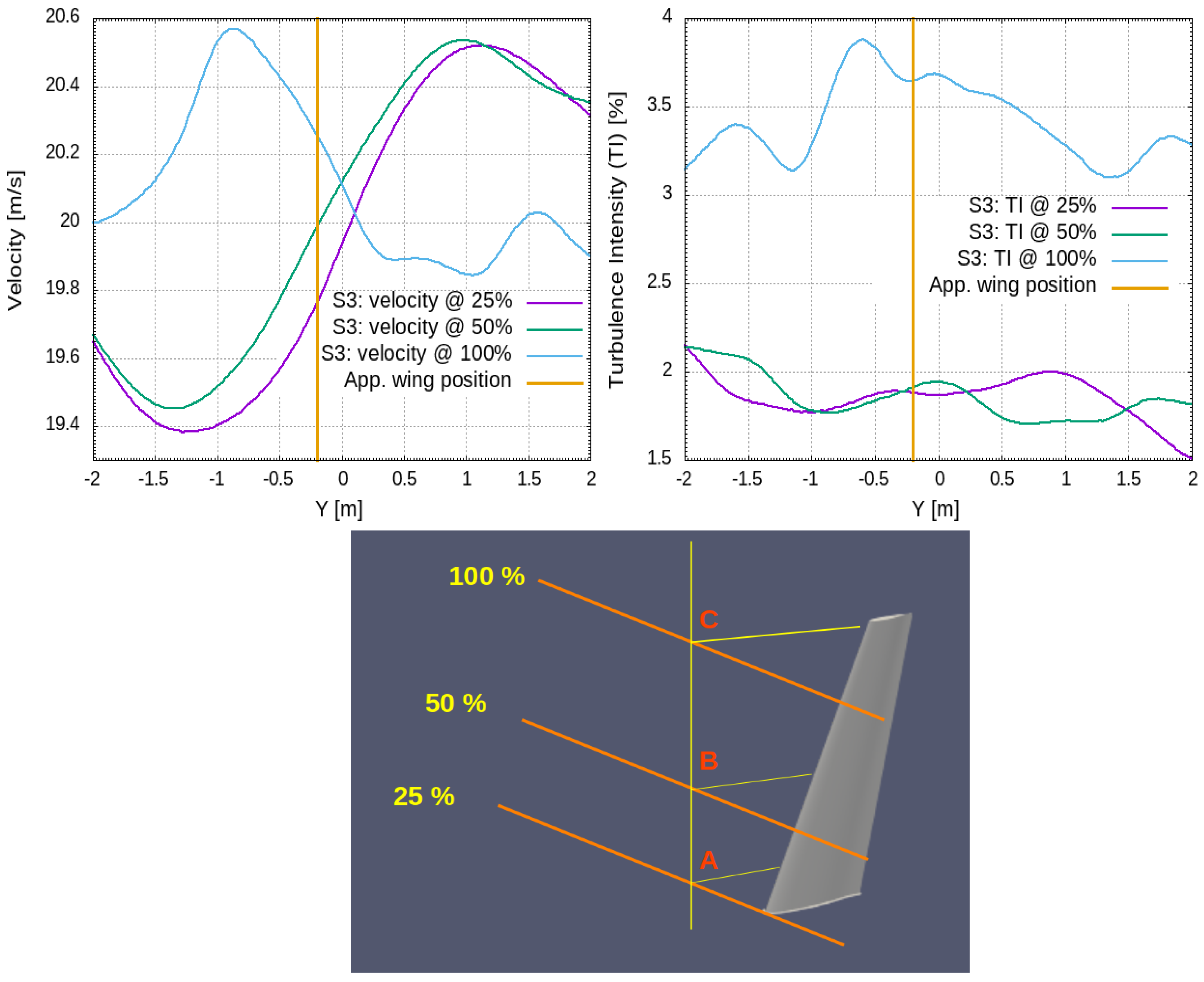- The inflow turbulence plays a significant role in the aerodynamic performance of the wing in question. Although the synthetically constructed velocity field that encounters the wing has a medium-level turbulence intensity , the predicted lift reduction is in the order of and the increase in drag close to , in comparison to minimal inflow turbulence simulation (S1). This fact does not pose a threat to the aircraft during take off, which is the main concern of the study, since a large portion of the lift is retained but increases the thrust requirements. These findings are in accordance with the bibliography that claims the aerodynamic performance mitigation of airfoils in turbulent weather calls for a more exhaustive research on the effect of turbulence on low-speed, swept-back wings under high loading conditions.